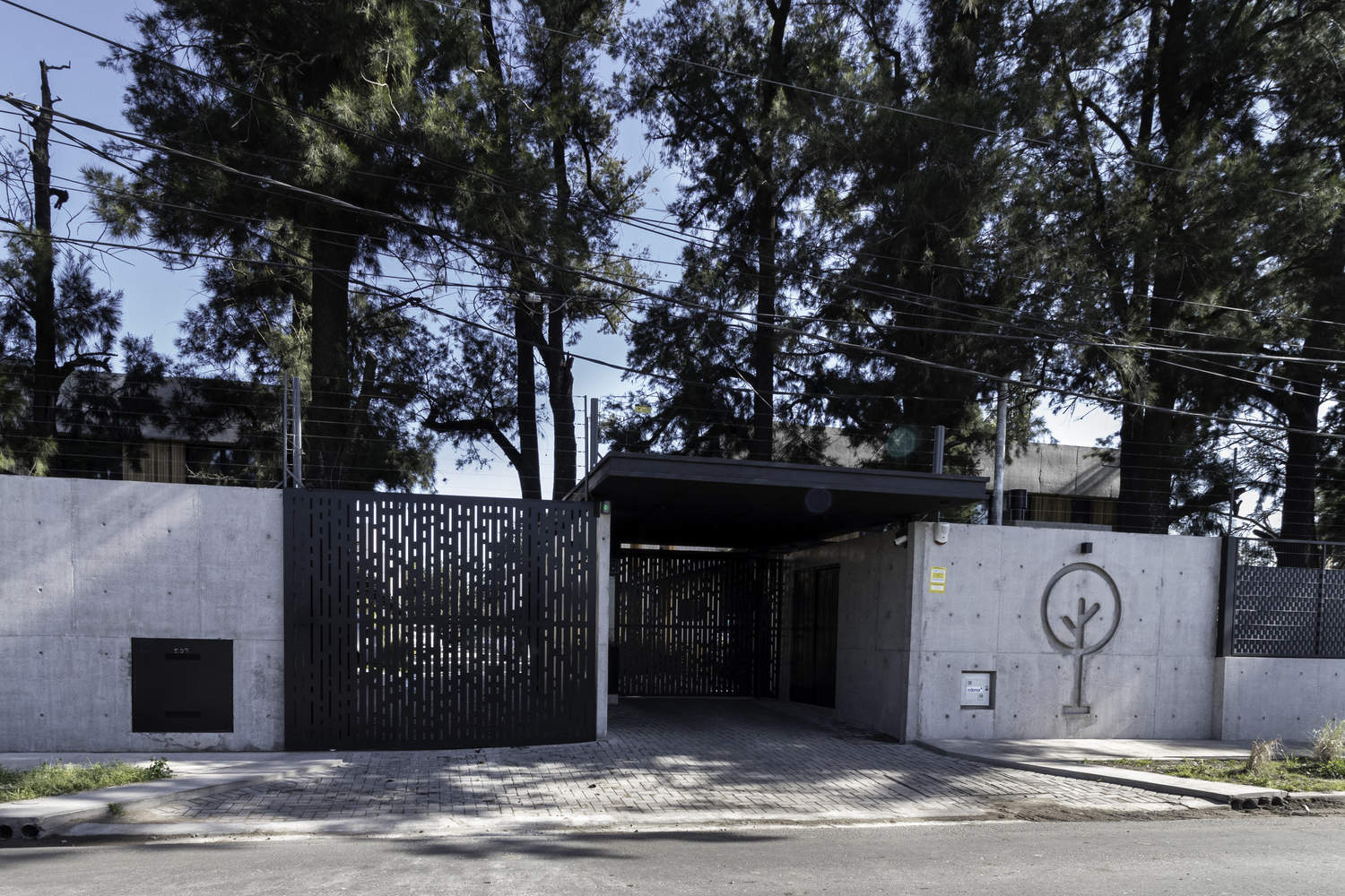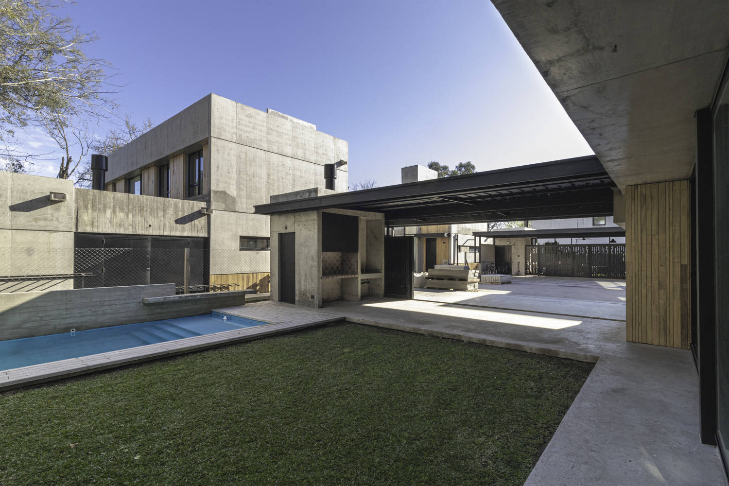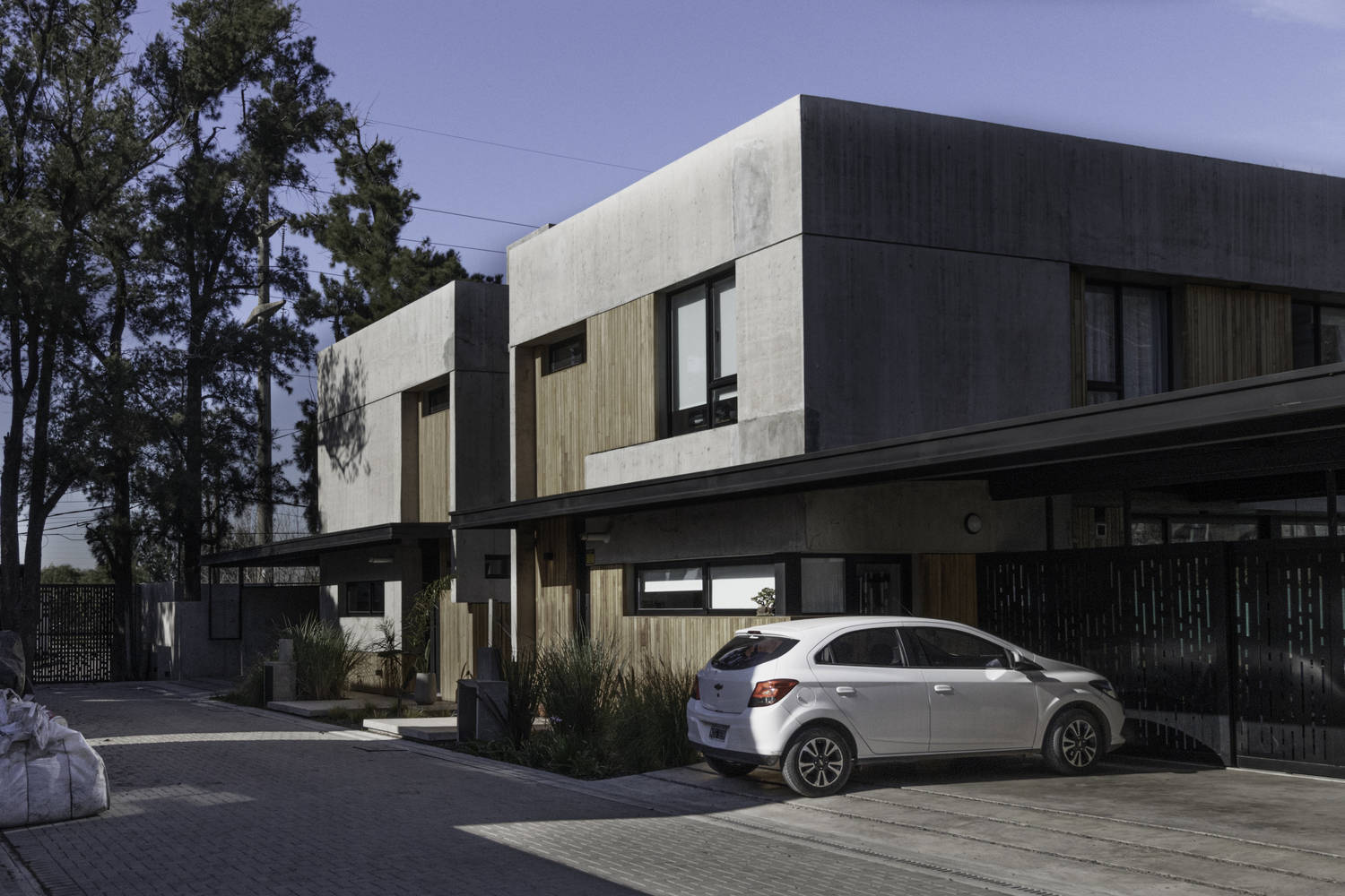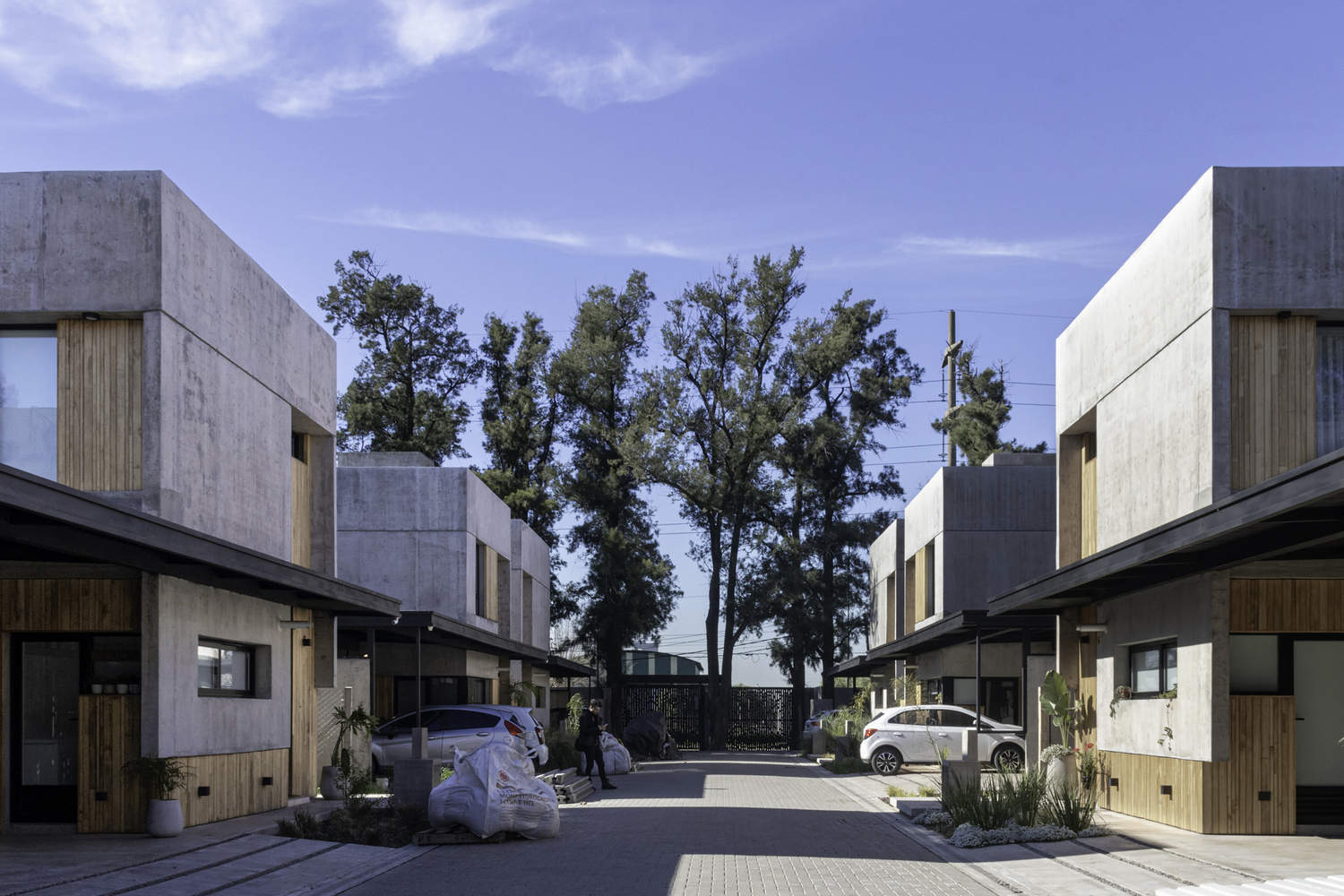 建筑师提供的文字描述Text description provided by the architects. Coihues is a neighborhood of ten houses situated on both sides of an internal vehicular street after passing through an important entrance gate. The access of each unit from this community street is private and has its own garage and a park area with a pool.