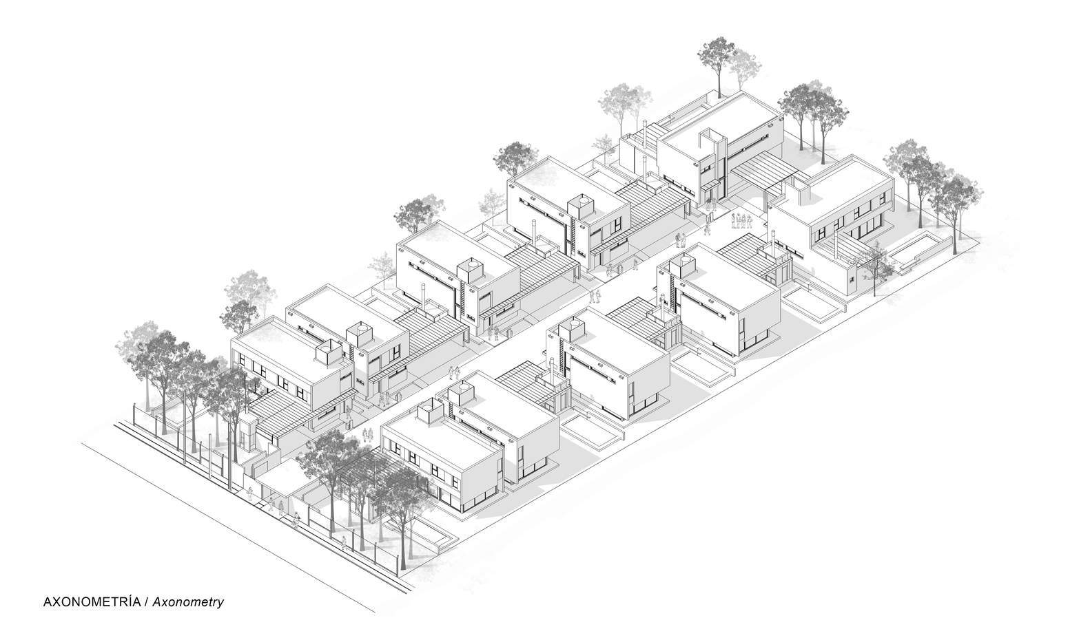 The emplacement layout has to do with a particular perpendicular position of each house with respect to the street in order to open up the central community space and, at the same time, to improve the sunlight of the private outdoor areas. As a result of this design, it stands as a small-scale neighborhood with high-quality community spaces and large areas of privacy for each unit.