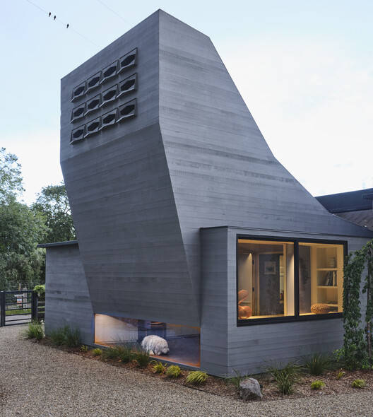 一个传统的国家“鸽棚”饲养鸽子或鸽子,有时是独立的,但通常建在房屋或谷仓的尽头。建筑师研究了最有利的高度、方向、比例和通风,以鼓励鸽子筑巢——这一过程决定了外部和内部空间的形状。这项工作也是对新葡萄酒乡村住宅“现代农舍”风格激增的回应——这些建筑虽然有传统农场建筑的外观,但往往与周围环境不成比例,位置不佳,考虑不周。