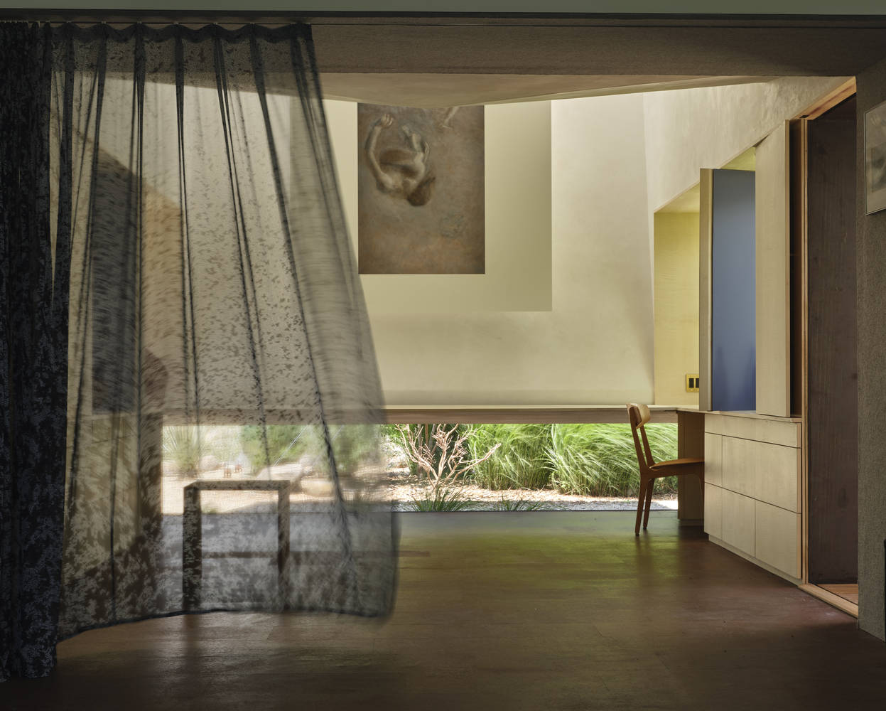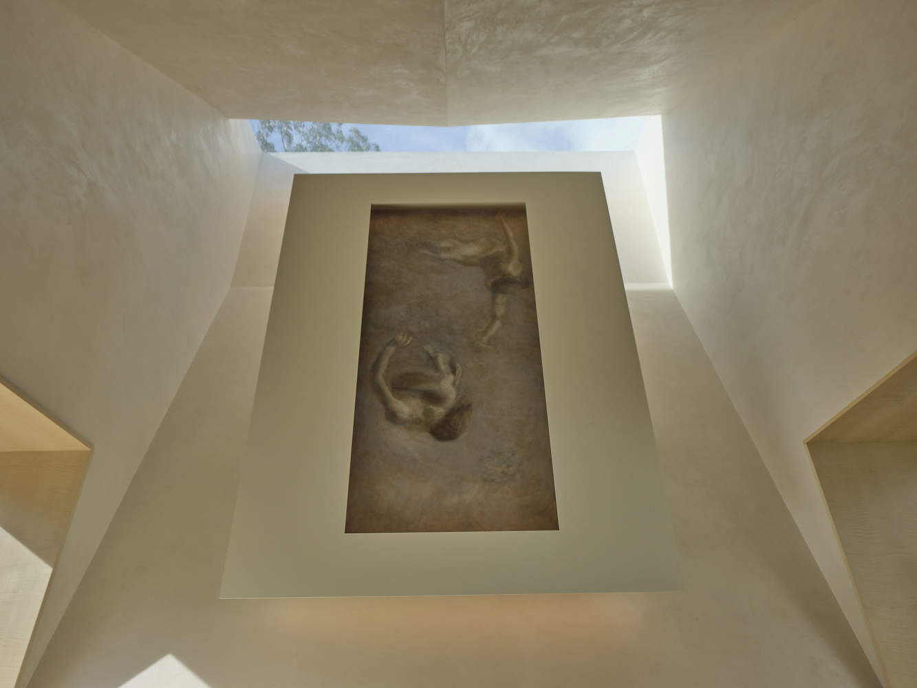 Although hidden from the interior, twelve nesting boxes built into the angled exterior façade encourage the bird's co-habitation of the space as in traditional dovecote structures. A lower bird-watching window focuses on the doves as they ground-feed and serves as a convenient viewing spot for the owner's two Spinone Italiani bird-dogs.