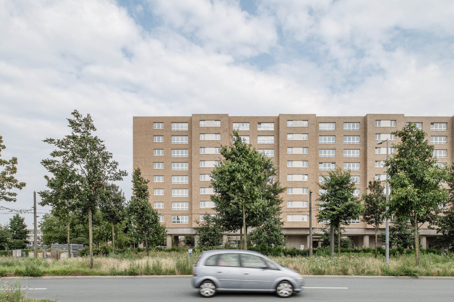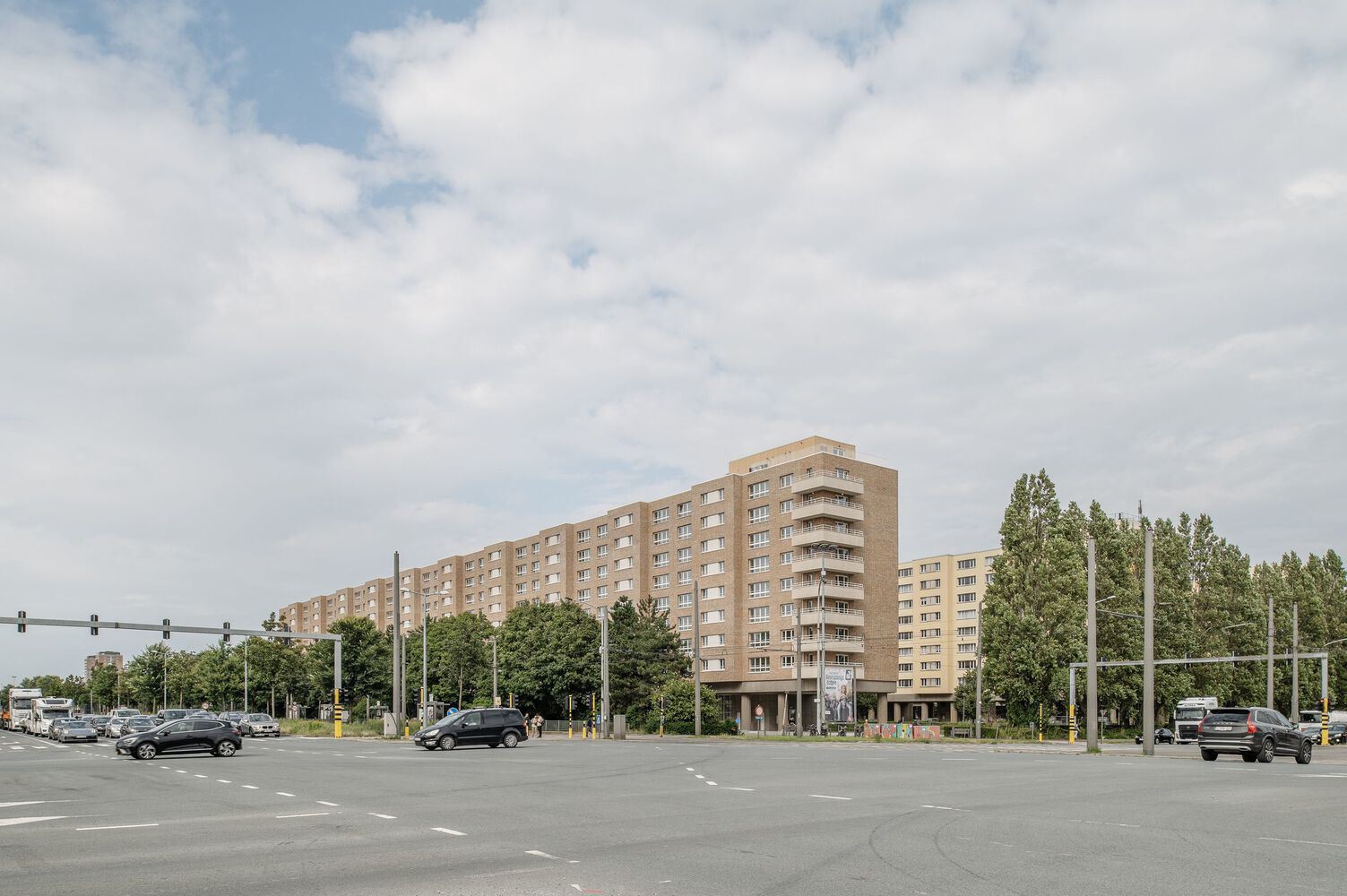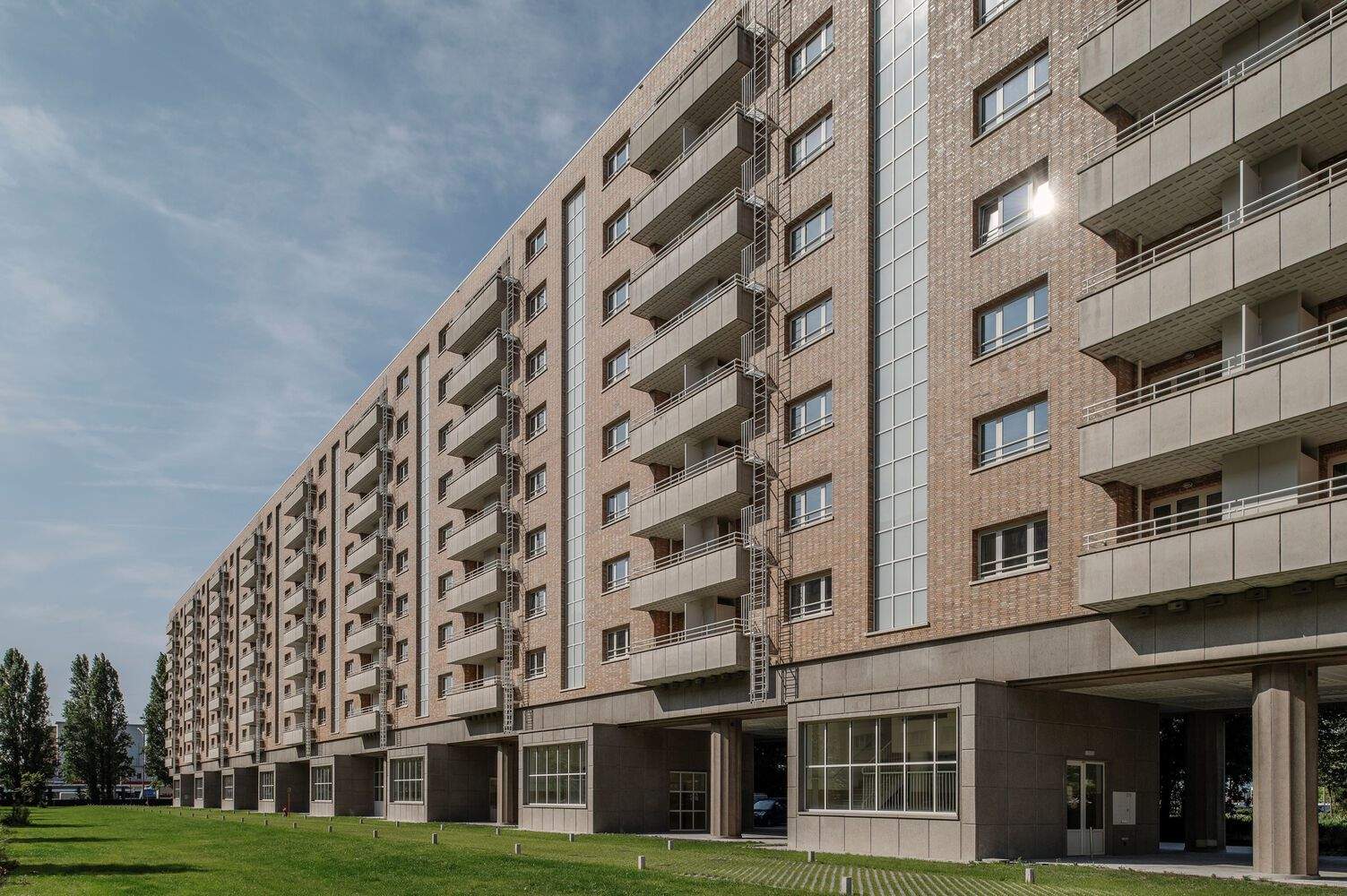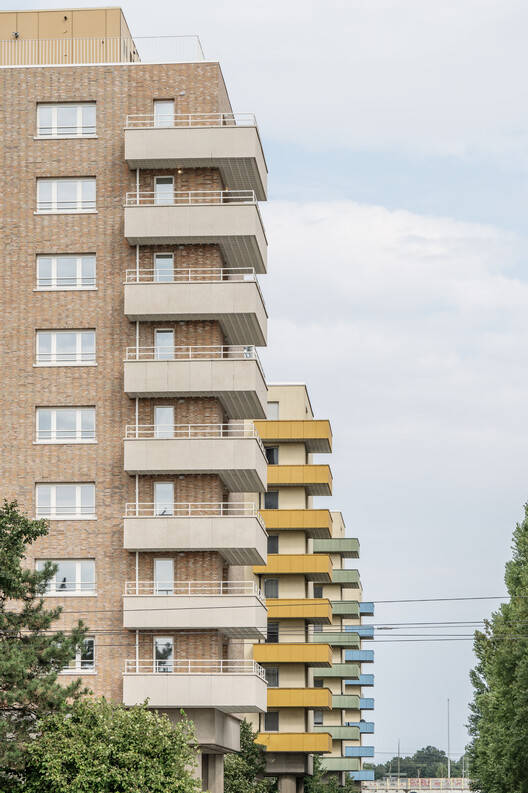 Listed in the inventory of architectural heritage in Flanders as part of the 'Luchtbal' social housing district, the buildings exemplify the pre-war CIAM (Congrès Internationaux d'Architecture Moderne) principles. The free-standing residential blocks, arranged in a linear formation and elevated on pilotis are typical of the principles espoused by the group. The base of the non-load-bearing façade is clad with concrete panels and features a striking yellow-orange brick veneer on the upper sections.
