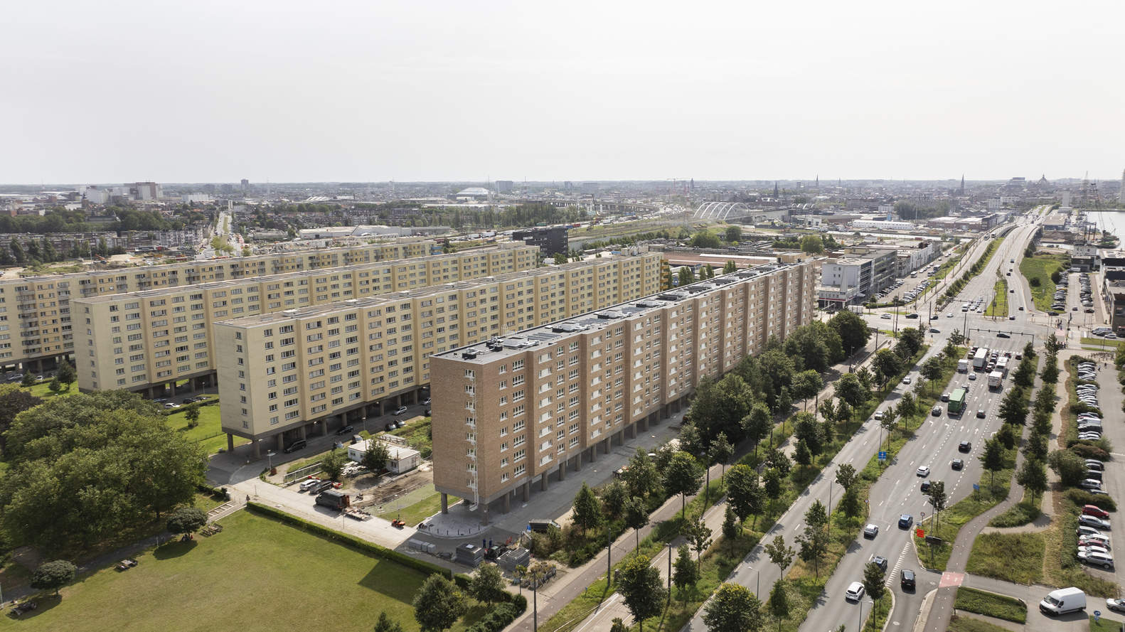 建筑师提供的文字描述该项目包括四栋住宅楼,共672套社会住房,是保护卢赫巴尔社区建筑遗产的重要一步。这些建筑最初由著名建筑师雨果·范·库伊克设计,经过精心修复,在尊重原始设计的同时,融入了舒适性和可持续性的现代标准。Langblokken综合体大规模翻修的第一栋建筑(A座)于2024年9月完工。