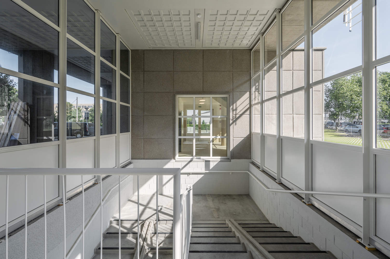 Simultaneously, we have made substantial improvements to the living conditions and energy performance, aligning the buildings with contemporary standards. To comply with the current EPB (Energy Performance of Buildings) standards and modern comfort requirements, it is necessary to insulate the building envelope. The application of new masonry as façade cladding, with bricks that match the original façade in color, texture, size, and pattern, restores the buildings to their original architectural appearance. On the ground floor, three new intermediary volumes have been added, but despite this, the openness of the ground floor has been largely preserved. The 10 circulation cores were completely demolished and rebuilt. Each core now features a compartmentalized staircase, a communal hall, and a large elevator shaft. The communal areas on each floor form a new structure within the footprint of the original cores. These upgrades were essential to bringing the circulation cores in line with current fire safety, accessibility, and acoustic standards.