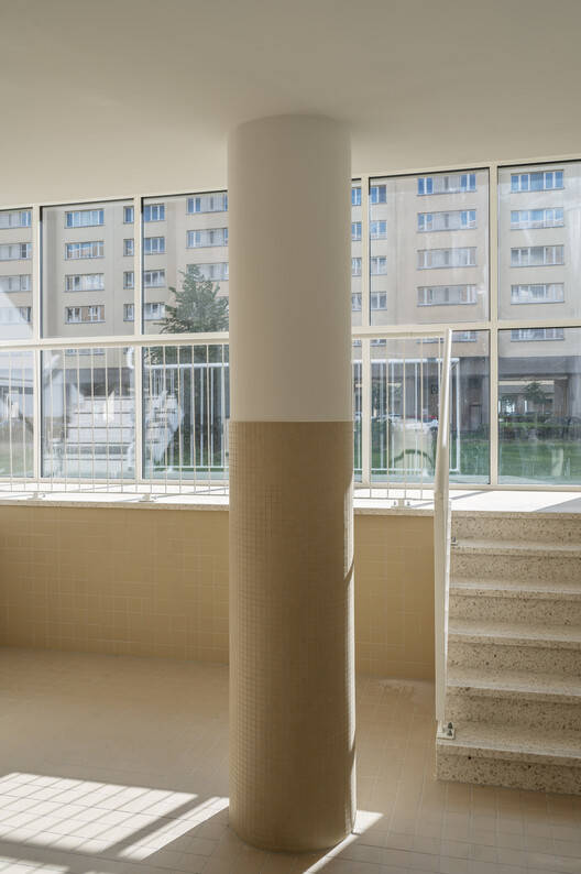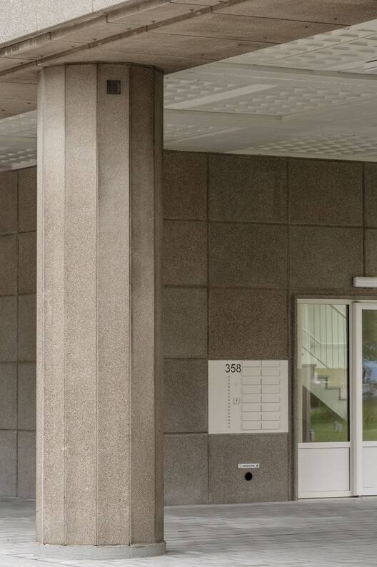 同时,我们对生活条件和能源性能进行了大幅改善,使建筑符合当代标准。为了符合现行的EPB(建筑能源性能)标准和现代舒适度要求,有必要对建筑围护结构进行隔热处理。采用新的砖石作为外墙覆盖层,用颜色、纹理、尺寸和图案与原始外墙相匹配的砖块,将建筑恢复到其原始的建筑外观。在一楼,增加了三个新的中间卷,但尽管如此,一楼的开放性在很大程度上得到了保留。10个循环核心被完全拆除并重建。每个核心现在都有一个分隔的楼梯、一个公共大厅和一个大型电梯井。每层楼的公共区域在原始核心的占地面积内形成了一个新的结构。这些升级对于使流通核心符合当前的消防安全、可达性和声学标准至关重要。