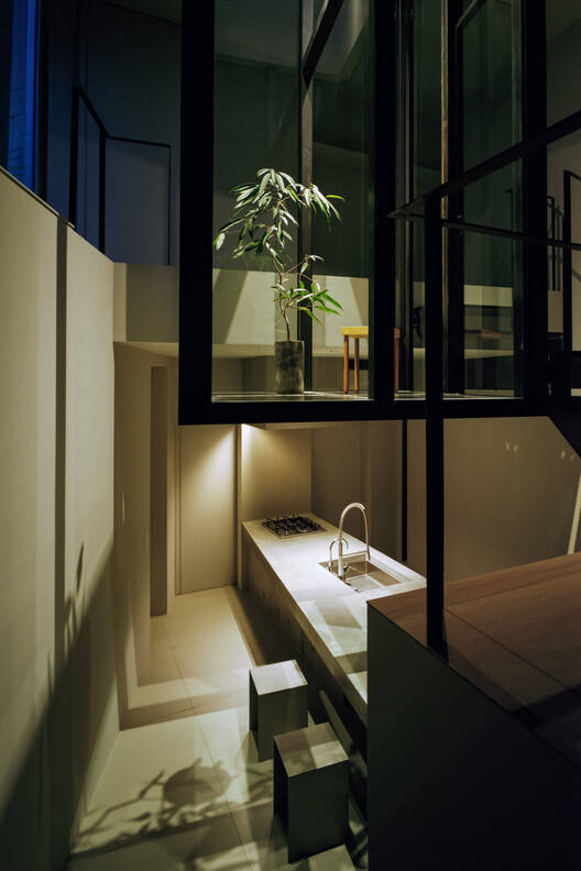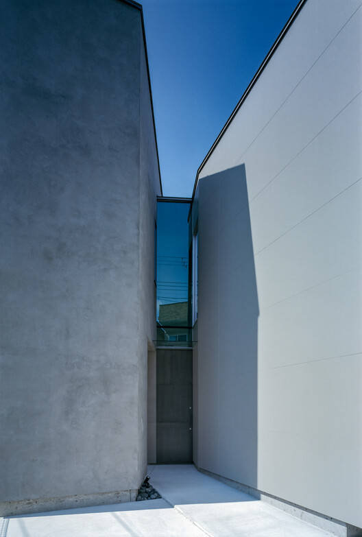 Text description provided by the architects. The site is in a quiet residential area where the client's family's old house originally stood, and we were asked to design a new building to replace the old one. The overall composition splits the building into two volumes, with an LDK (living, dining, and kitchen area) and private rooms arranged separately. The main space is designed with split floors to increase the sense of spaciousness, creating connections not only in the plane but also in the cross-section so that one can communicate with others in the dining room and kitchen.