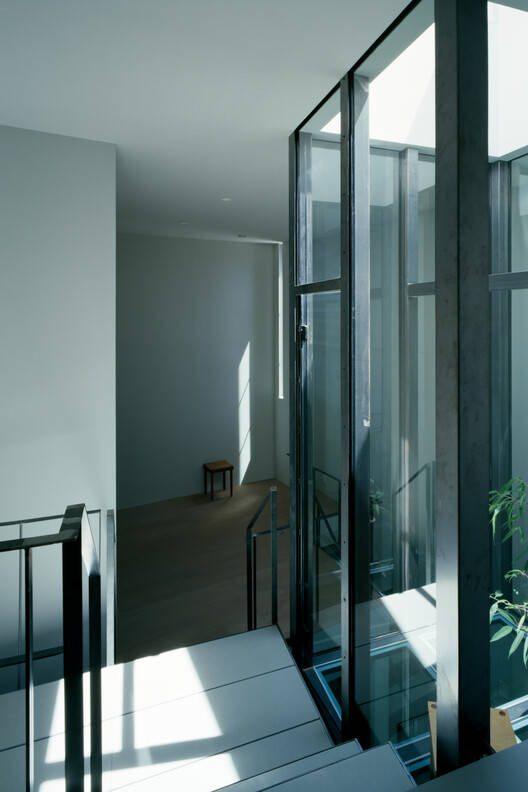 At night, the entire glass box of the sunroom glows like a lamp, illuminating the entire space. The steel and concrete finishes are revealed in various places, and one can appreciate how their expressions change over time. This is one of the things to be enjoyed in this house. The space we created has a unique atmosphere, and family members can discover various ways of viewing the house and spending time there in their daily lives.