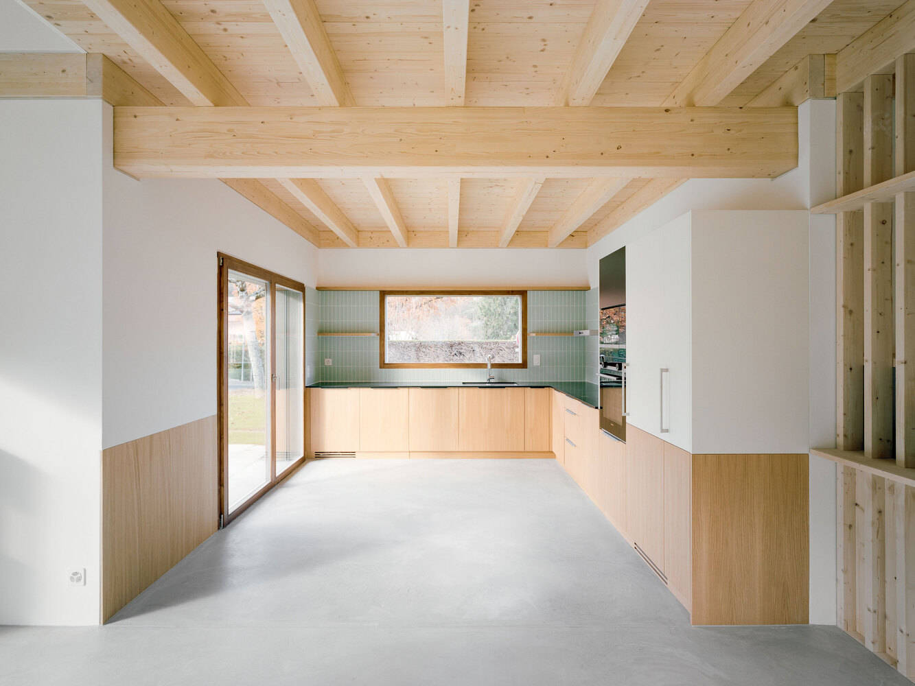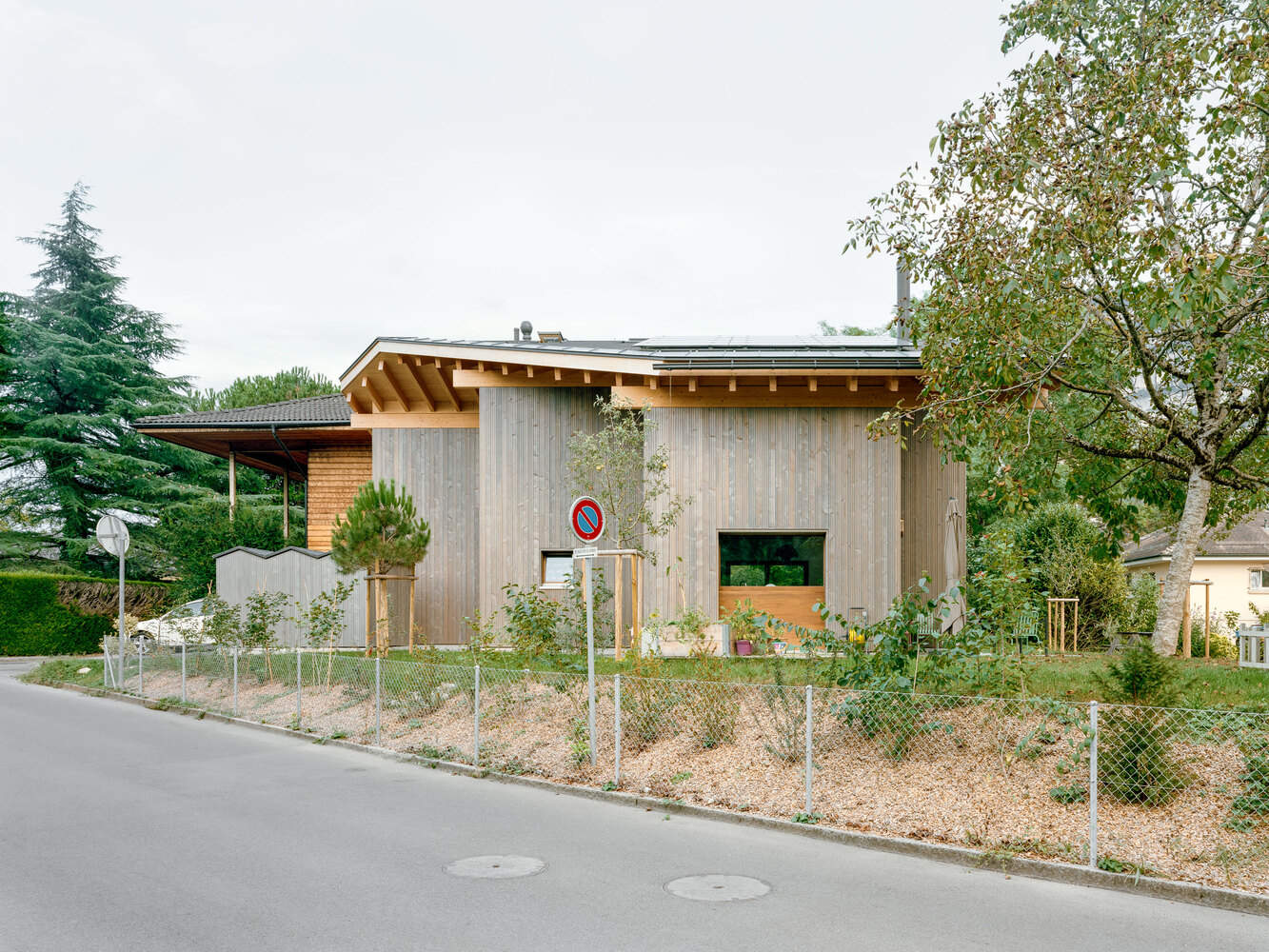 得益于其全木结构和外墙、带热和光伏太阳能电池板的大型屋顶以及空气-水热泵供暖系统,该建筑符合THPE(Très Haute Performance Energétique)标签的要求。