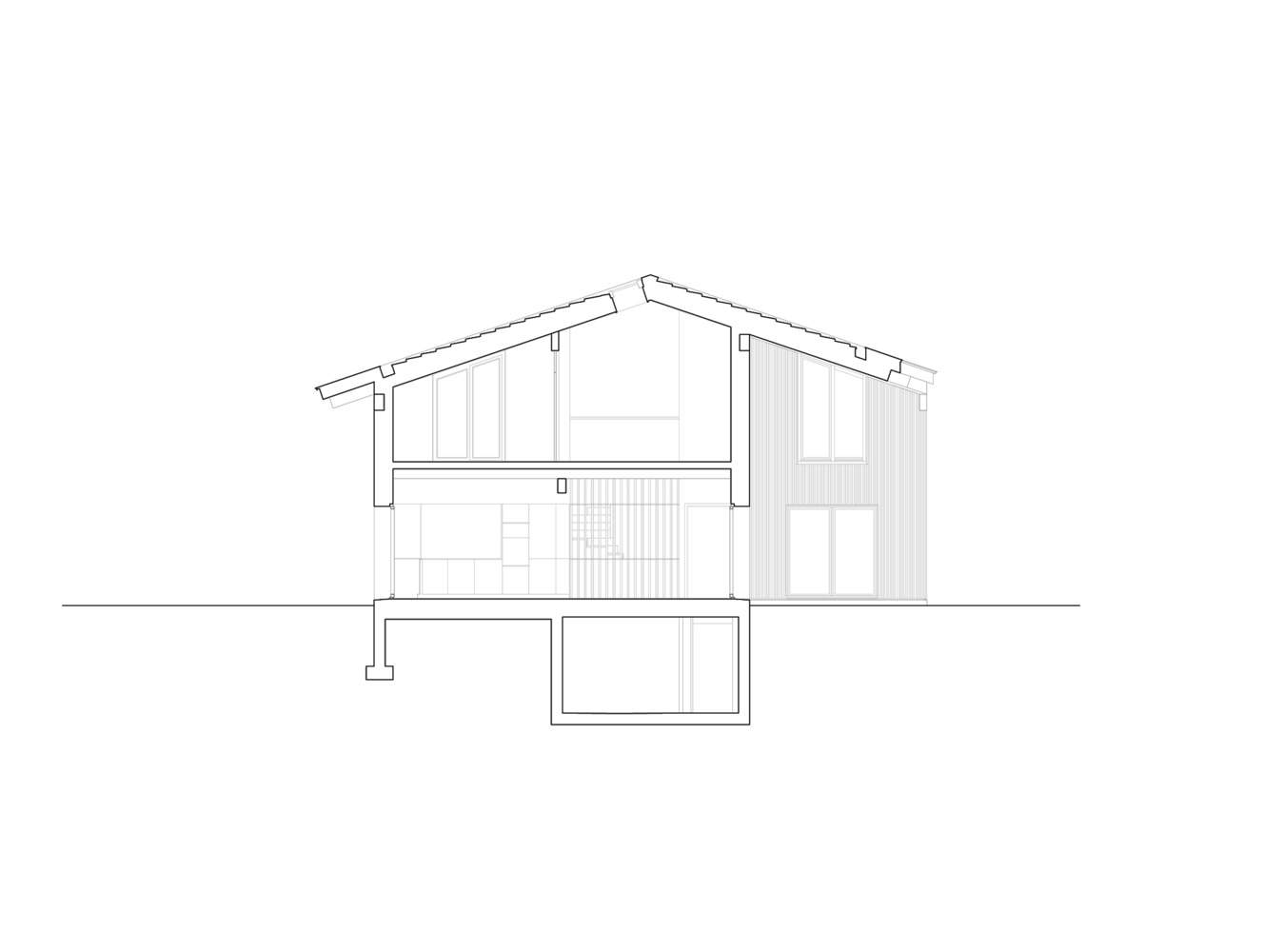 Text description provided by the architects. The development comprises a two-storey villa of around 150 m², built adjacent to the existing family home dating from the late 1990s. It consists of a large unitary gable roof housing different volumes based on a square grid. This fragmented composition, unified by its roof, makes it possible to tame the diagonal available for this house.