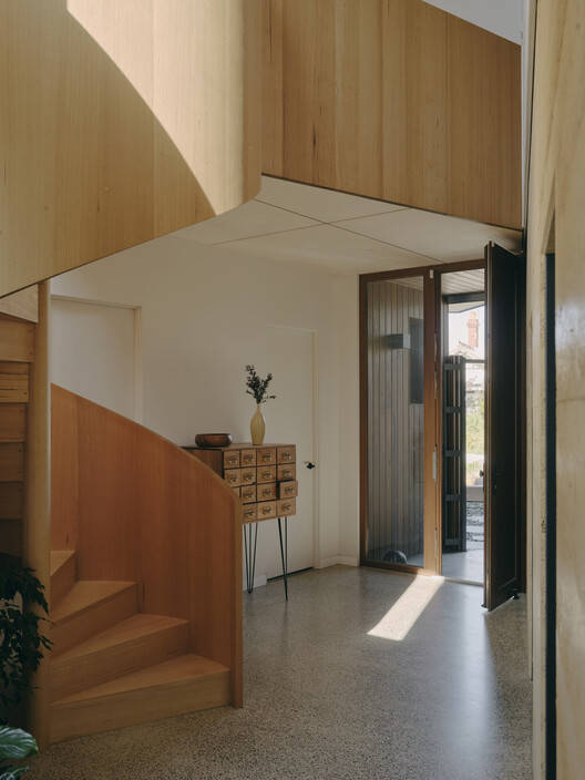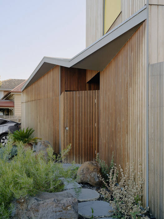 父母侧楼很隐蔽,厨房后面有一个楼梯,通往带私人露台的主卧室,而孩子侧楼则有一个开放的圆形木楼梯、一根消防杆和一个可以通往街道的花园。正面在它的存在下是随意的,并公开地与社区相连。我们拆除了前围栏,创造了一个开放的前院,里面种着当地植物和休闲休息区。