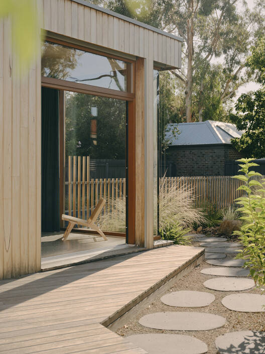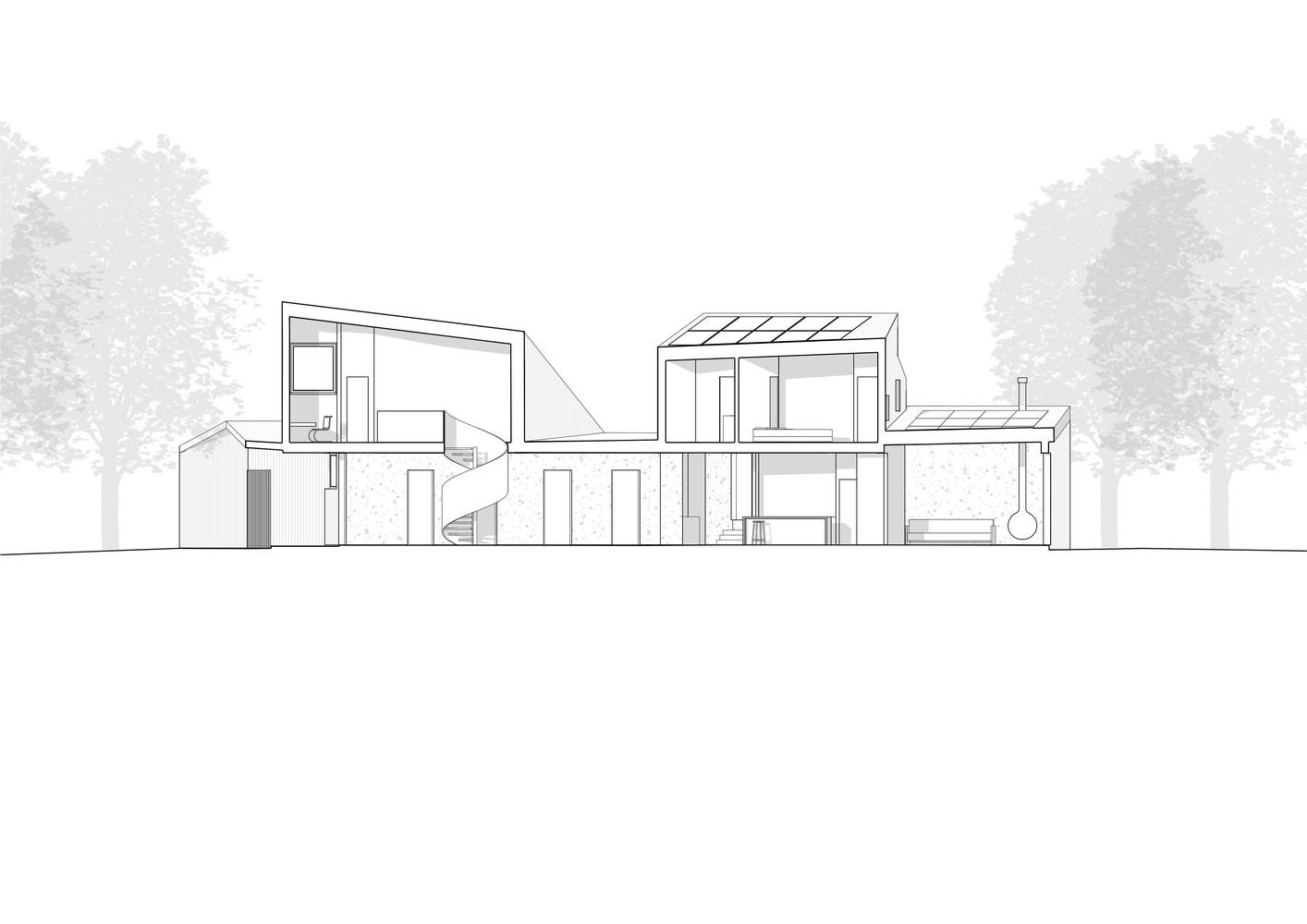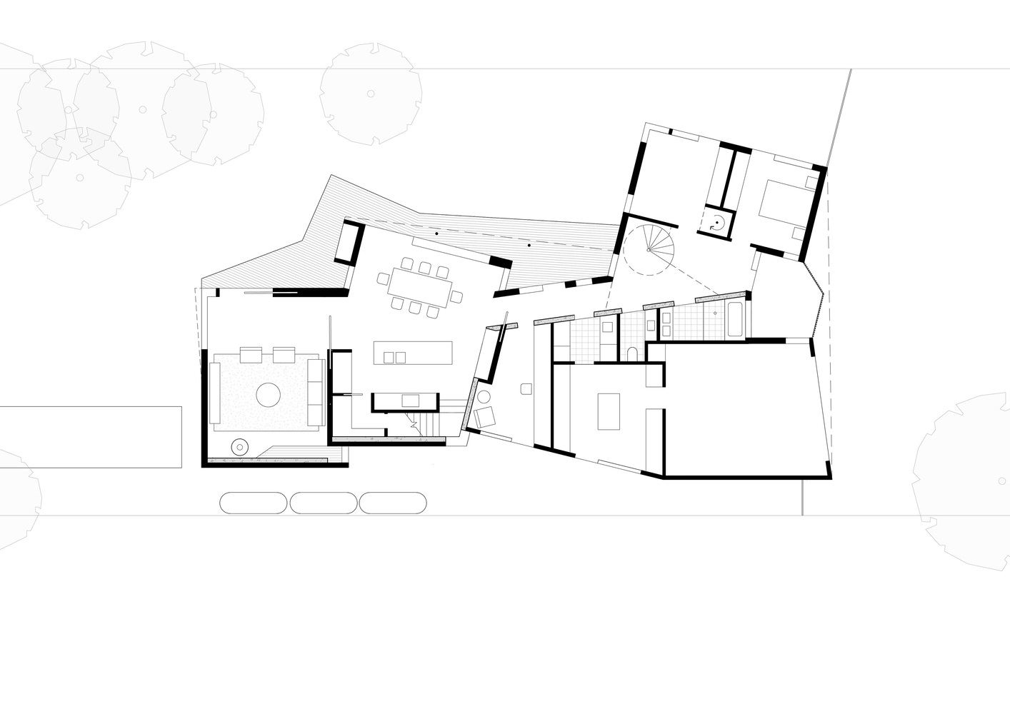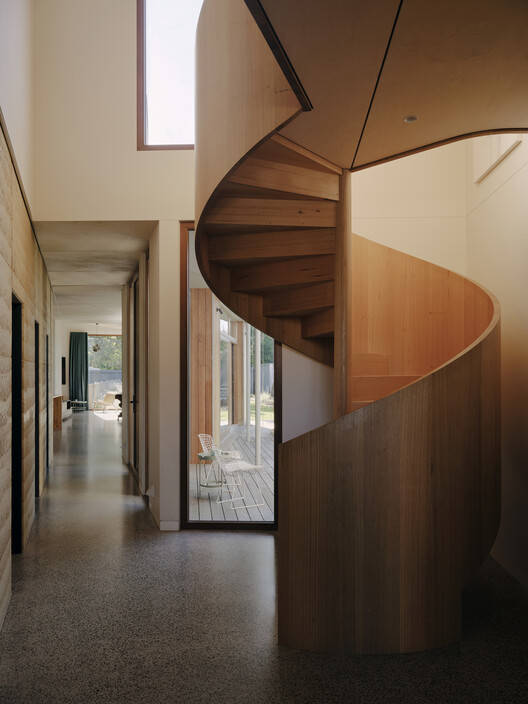 Despite its formal complexity, the house was economically constructed around a rammed earth spine, selected for its low embodied carbon, thermal mass, acoustic quality, as well as the way light animates its surface. A light-controlling veranda, strategically placed windows for natural ventilation, and thick walls with integrated automated awnings ensure stable indoor temperatures - reducing reliance on artificial climate control. Clad in timber destined to mature gracefully, it symbolizes a symbiotic relationship with nature.