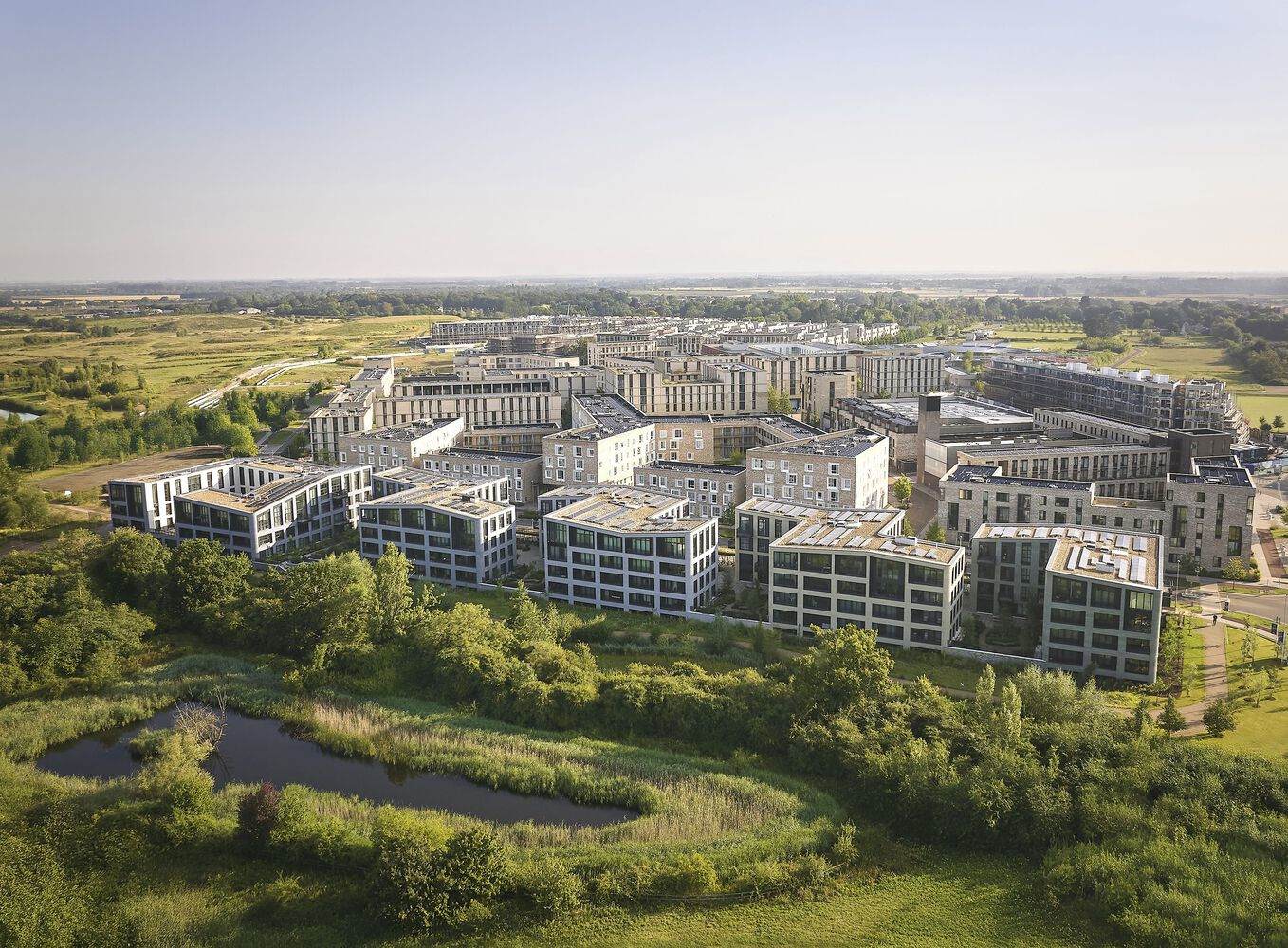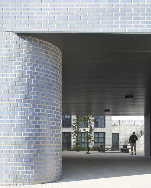 Drawing upon 19th-century warehouse and mill typologies traditionally found bordering rural settings, the Rubicon evokes a sense of historical continuity with its location, clearly defining the urban edge. A sculptural roofline that rises and falls softly unites the separate forms, echoing the Cambridgeshire landscape. The western edge of the site features a courtyard block inspired by Cambridge's famed colleges. The glazed brick material palette of shimmering hues, from tranquil green and yellow to light blue, azure, and silvery grey, gives each façade a unique identity. Deeply recessed south-facing balconies provide solar shading while offering unobstructed views.