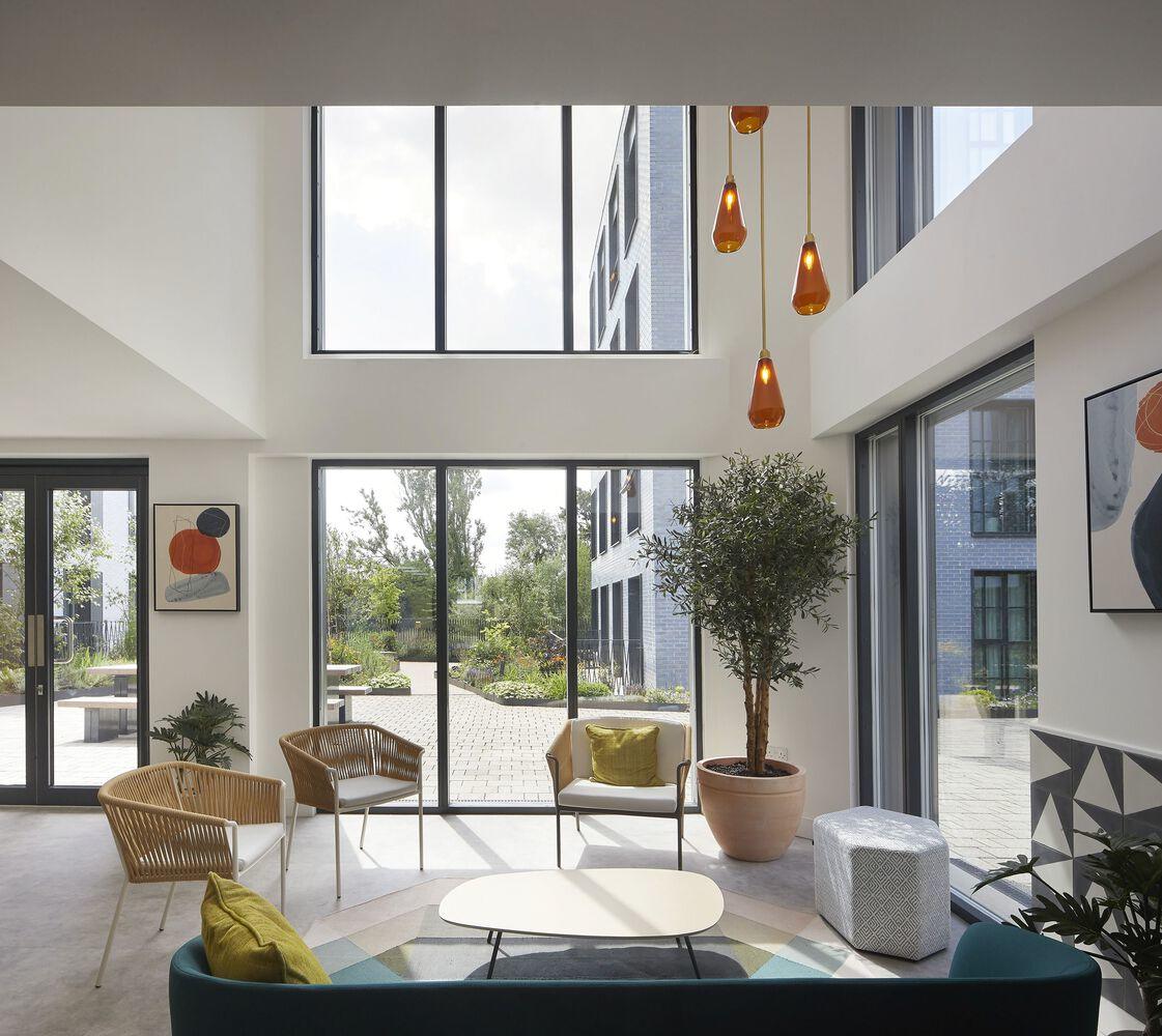 Tom Hill, Managing Director at The Hill Group, says, "Rubicon sets the standard in sustainable living, using innovative, seamlessly integrated methods to minimize environmental impact. Key features include a development-wide rainwater harvesting system and underground waste management.'' The development offers 186 homes over 0.74 hectares, 35% of which are dedicated to university and key-worker housing, in five tessellating S- and L-shaped buildings. Their distinctive architectural language, featuring glazed bricks, curved corners, and undulating roofs, conveys permanence and versatility. Between the buildings, urban-facing courtyards connect with ones that look out over the landscape to 'stitch' these two contexts together.
