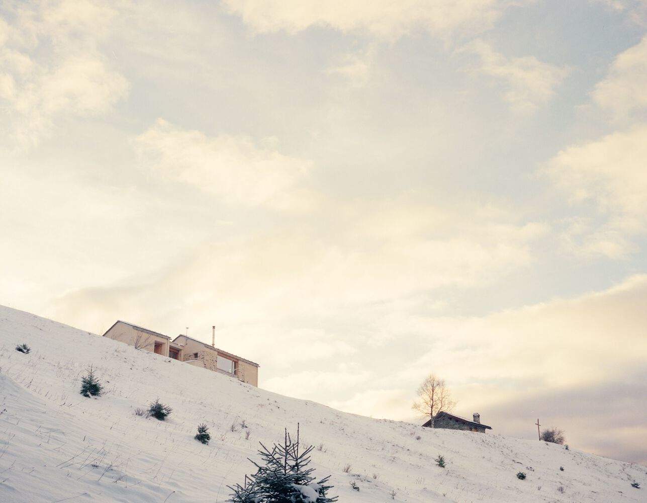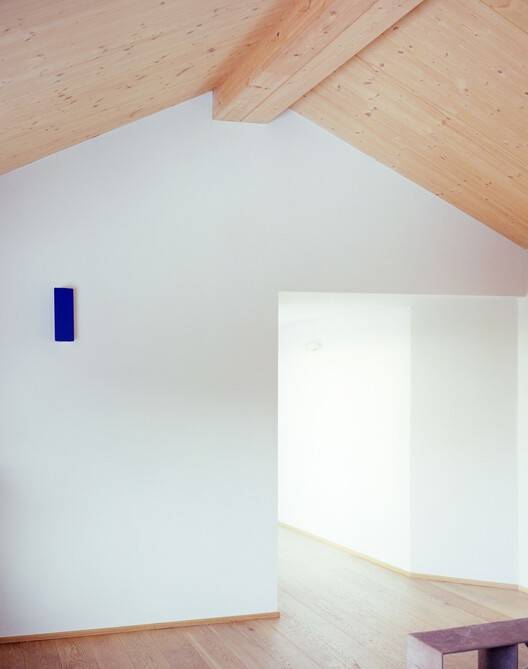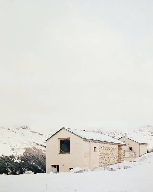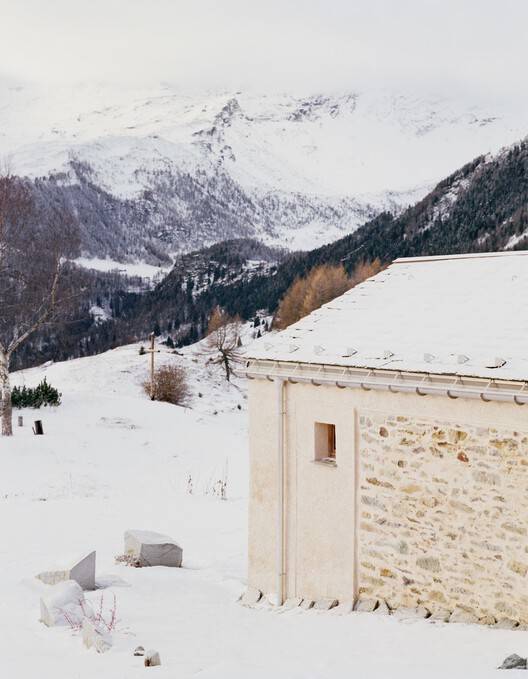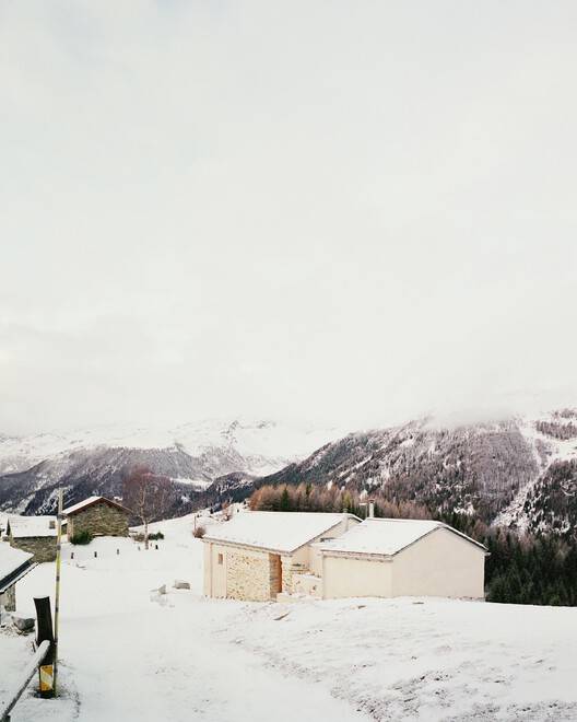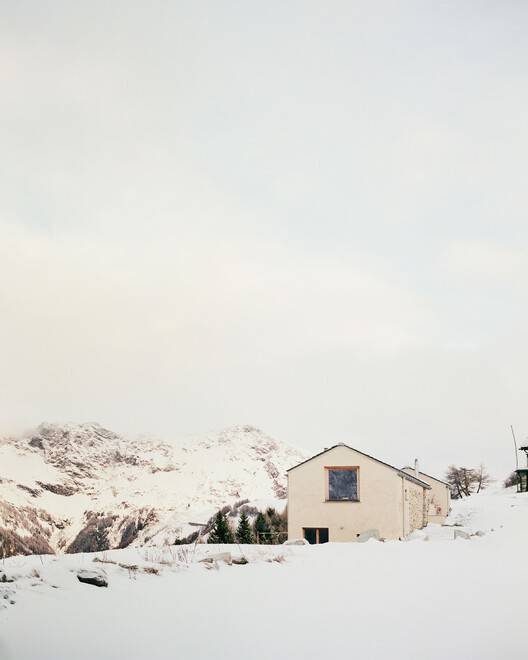 Text description provided by the architects. The project intends to make evident the process of transformation of the building: from a building for rural use to a seasonal residence. Since changes are configured from the volumetric point of view, the intention is to make obvious any "added" elements. The building on the site of the first parcel of land is reconstructed into a single-story in lime plaster. It is to maintain the airtight character of the original building; for this reason, it is distinguished through a single opening set back from the outer edge of the wall. This choice allows for a "void" marked by a deep shadow, as is often the case with rural buildings, and not a reflection of glazed elements.