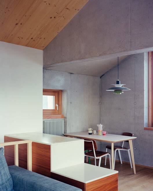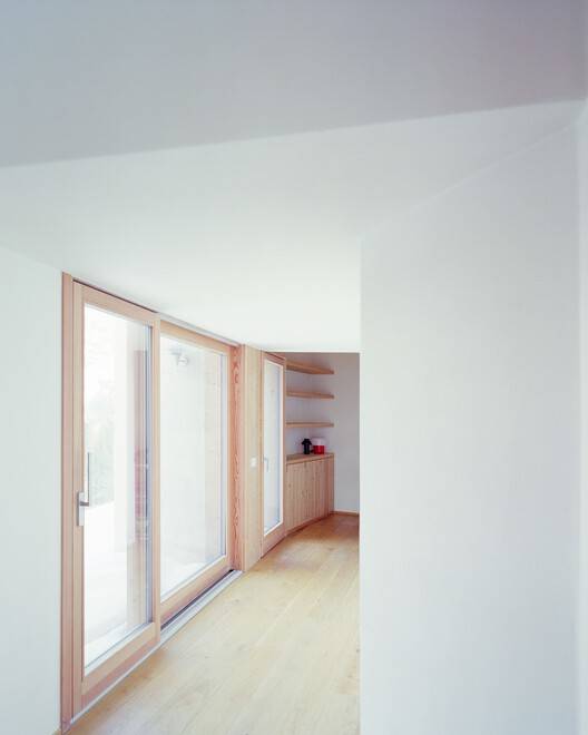 材料选择与细节处理: 该项目在材料选择和细节处理方面展现了高度的专业素养。石灰灰泥作为主导材料,不仅与当地的建筑传统相符,也赋予了建筑独特的质感和美学价值。立面设计中,东侧的静音处理与西侧的景观开放形成对比,体现了设计师对不同方向的精心考量。水池和覆盆子的运用,既丰富了立面元素,又创造了视觉焦点,增加了建筑的趣味性。这些细节处理,共同构成了项目完整的设计语言,展现了建筑师对材料、光线、空间和环境的深刻理解和精准把握。