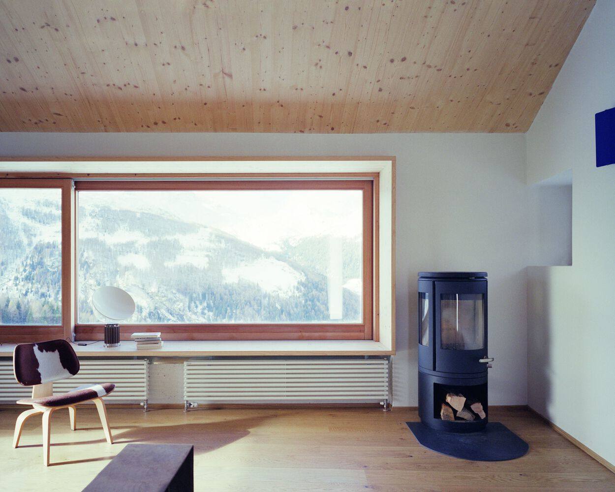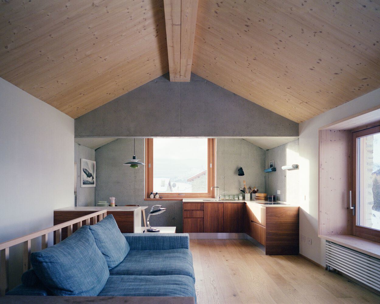 The project consists of two floors: on the ground floor, there is a sleeping area consisting of a room, a service bathroom, and a multi-purpose room to the south. Through a straight staircase,e there is access to the living floor located above. It consists of a single space in which the kitchenette is located. Through a small glazed corridor,r one has access to the study. The living area, like the room on the ground floor, is distinguished through a large window placed to the west.
