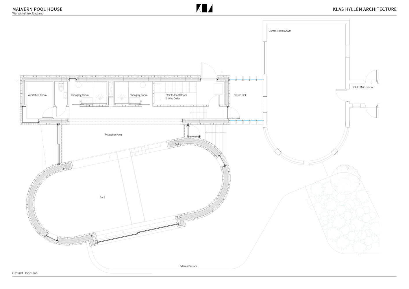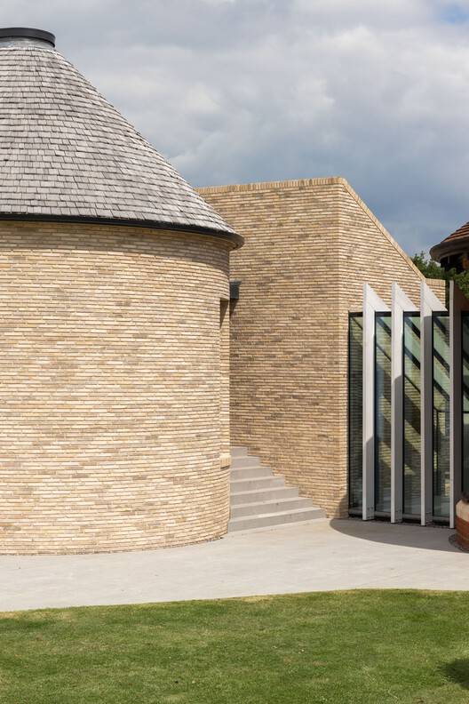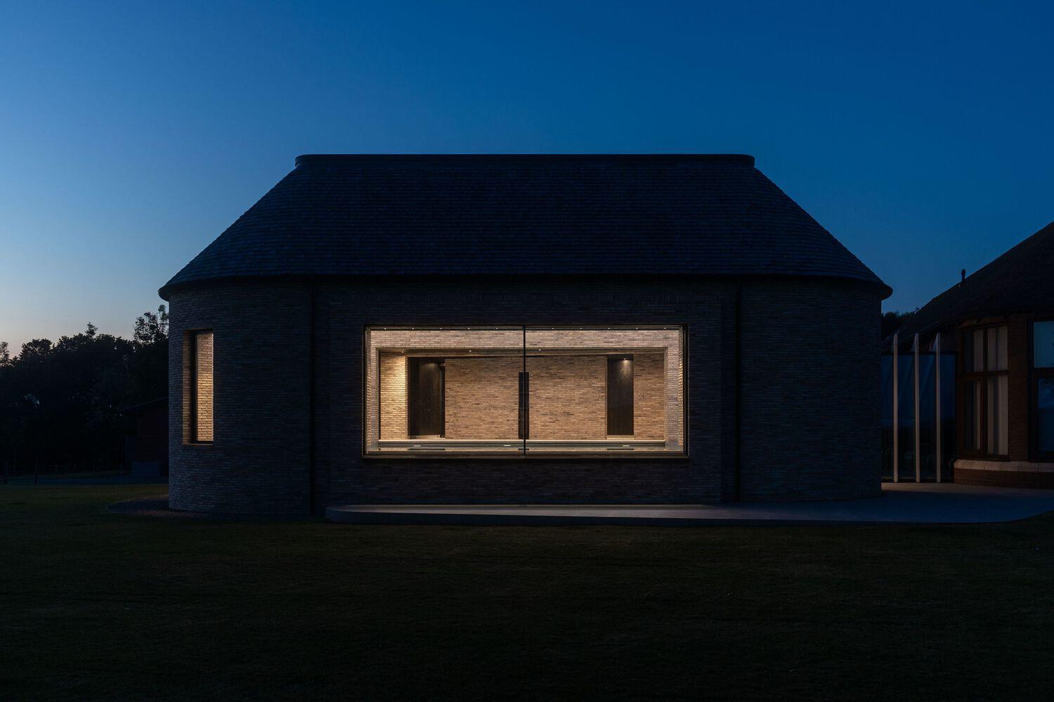 Text description provided by the architects. Malvern Pool House by Klas Hyllén Architecture is a visually stunning companion to an Arts & Crafts inspired home, perched on a hilltop in rural Warwickshire, housing a swimming pool and a sequence of relaxation rooms. The new addition comprises two interconnecting volumes of clay brick, minimal in appearance, yet materially rich and exquisitely detailed. Sweeping views across the Malvern Hills are balanced with a vast, light-filled volume with a cathedral-like diagrid ceiling that appears to float above the swimming pool.