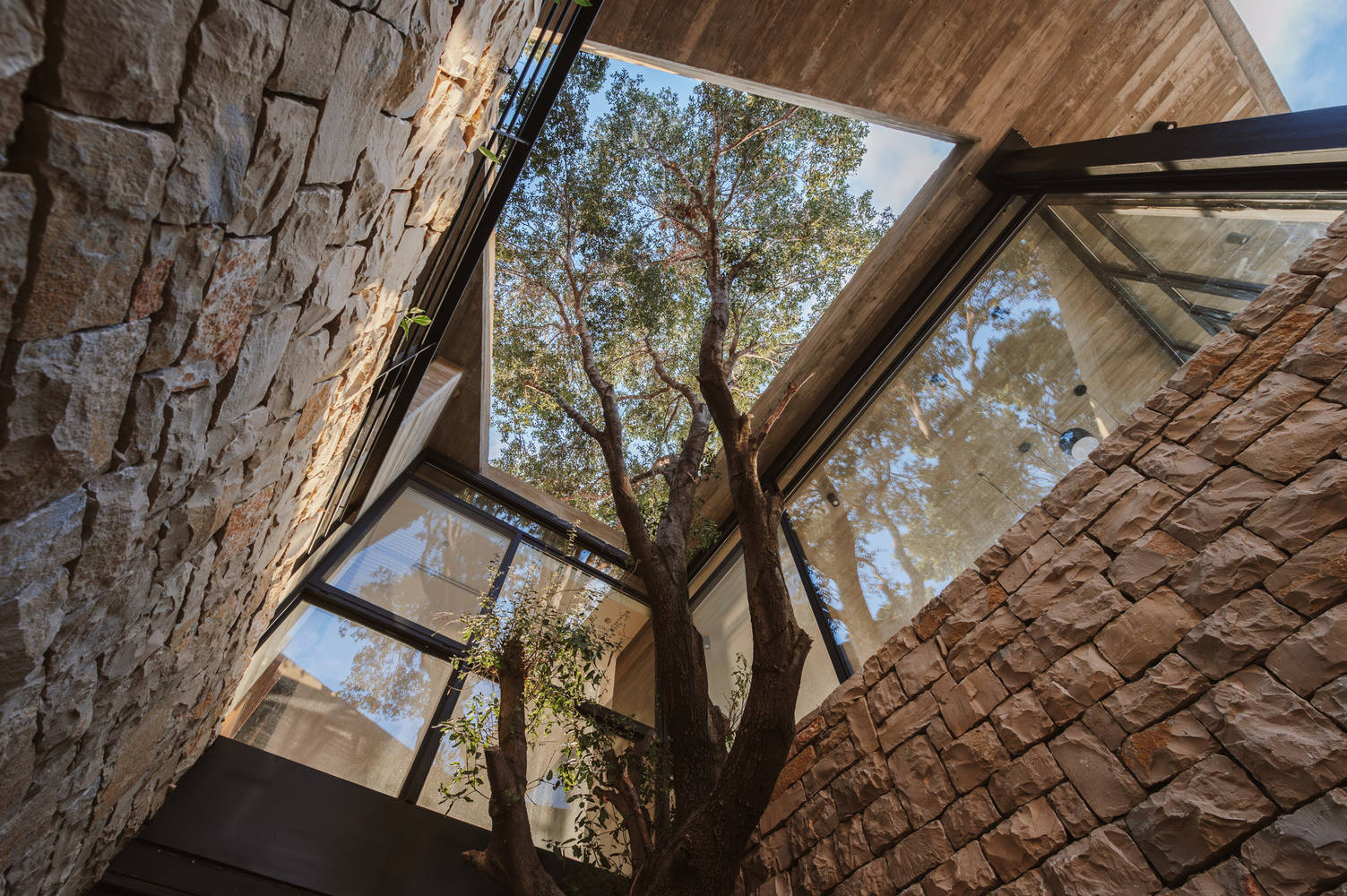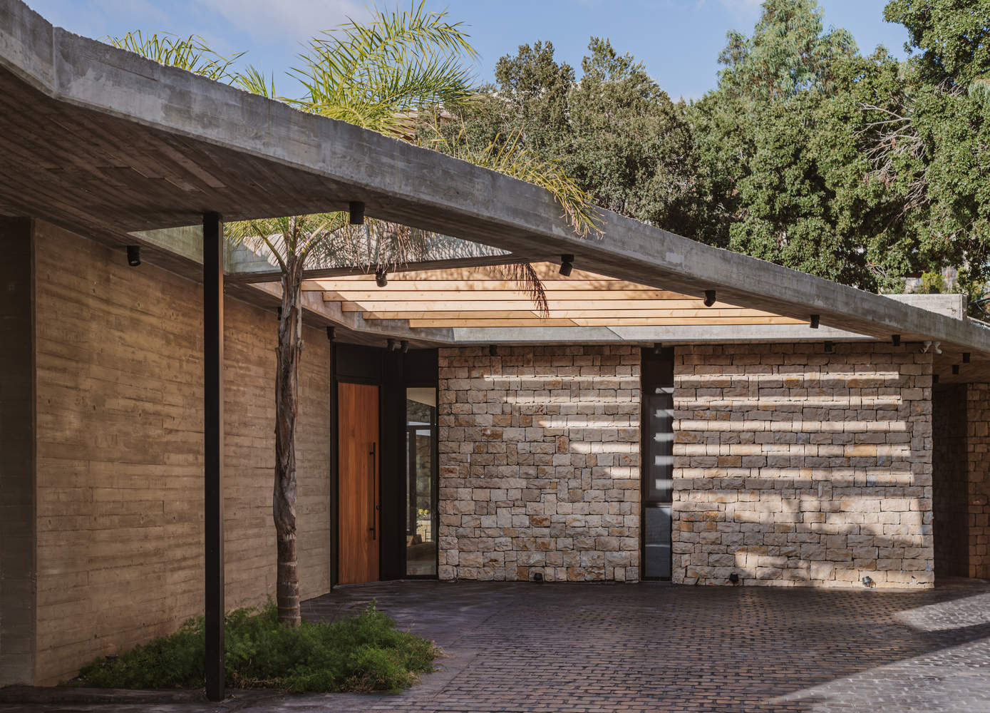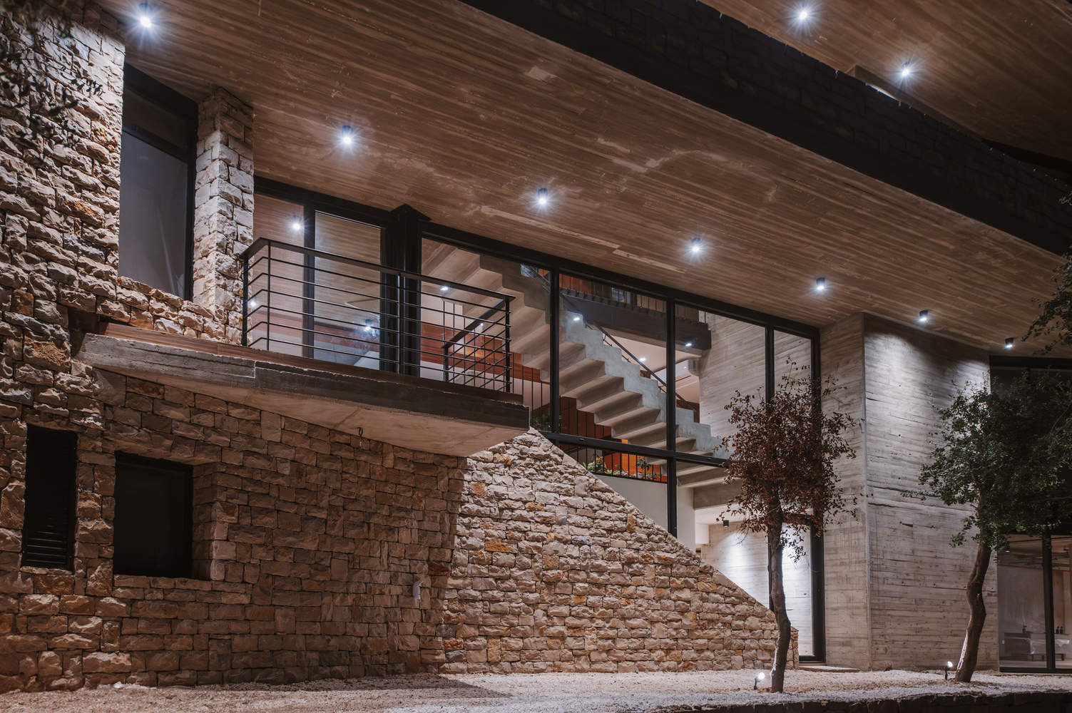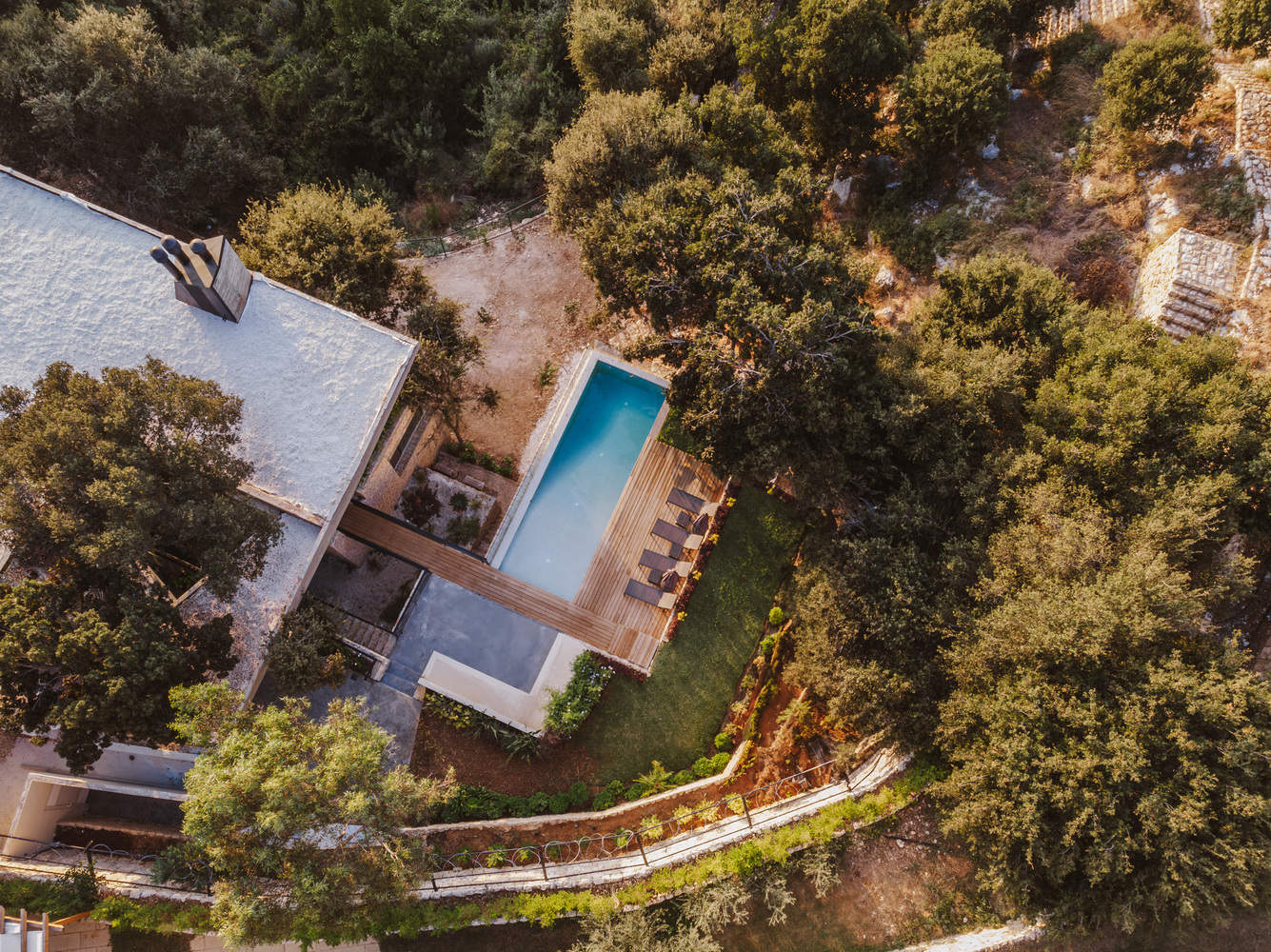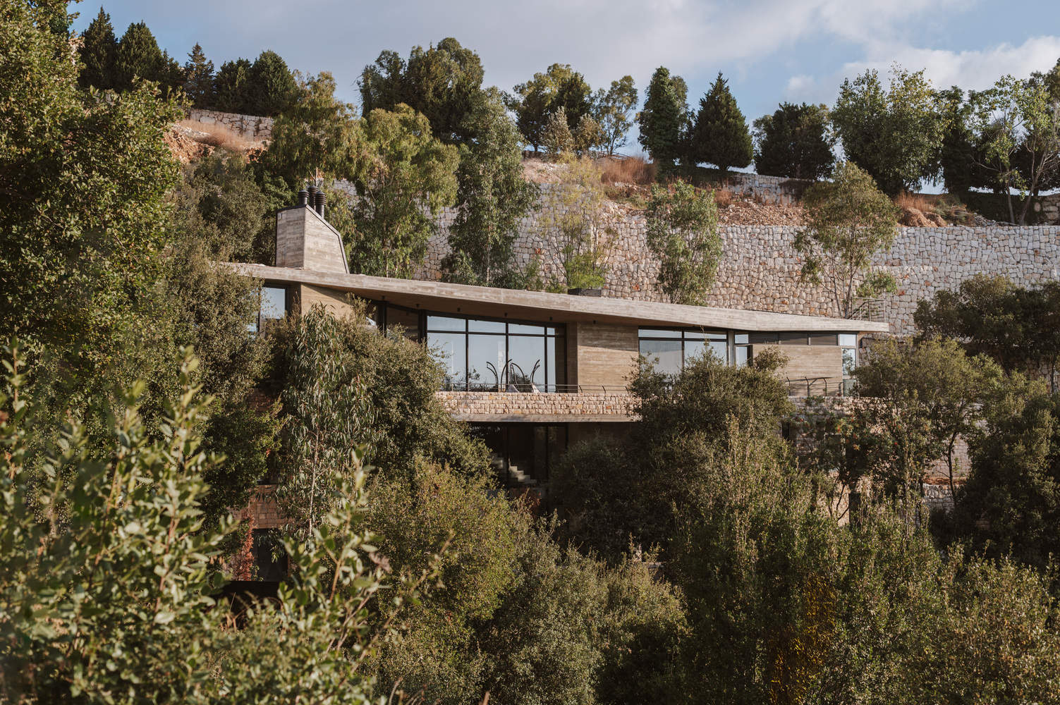At its core, the concept is simple yet powerful: a monolithic volume, crafted from locally sourced stone, emerges from the terrain, supporting a floating concrete slab that provides shelter and shade. Thoughtfully carved openings allow the trees to remain untouched, blurring the boundaries between interior and exterior. The result is a seamless integration with the landscape, where dappled light filters through the canopy, and the rhythms of nature shape the living experience.