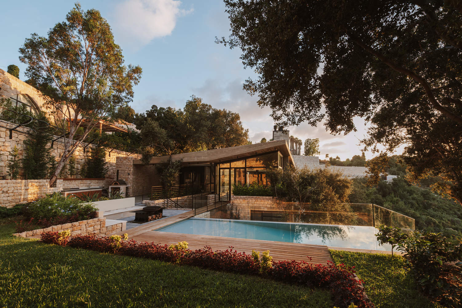{设计精髓:该项目最核心的精髓在于其对“自然与结构对话”的完美诠释。建筑师将对自然的敬畏融入设计之中,通过利用当地石材和混凝土,创造出与地形融为一体的建筑形态。同时,他们还保留了周围的橡树,从而将建筑融入环境,而非凌驾于环境之上。项目的设计精髓在于其对“对话”的理解和运用,不仅体现在建筑与自然之间的对话,也体现在内部空间与外部环境的互动。无边际泳池的设计更是将景观引入建筑,增强了空间的通透感和连续性。这种设计手法展现了建筑师对自然环境的深刻理解和对空间关系的精准把握,充分体现了“建筑即是环境”的设计理念。
