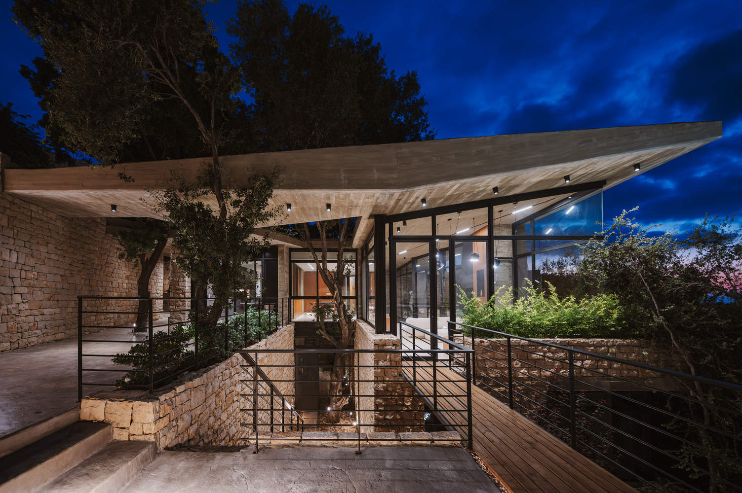 其核心是,这个概念简单而强大:一个由当地石材制成的整体体从地形中出现,支撑着一个浮动的混凝土板,提供庇护和遮阳。精心雕刻的开口使树木保持原样,模糊了内部和外部之间的界限。其结果是与景观无缝融合,斑驳的光线穿过树冠,大自然的节奏塑造了生活体验。