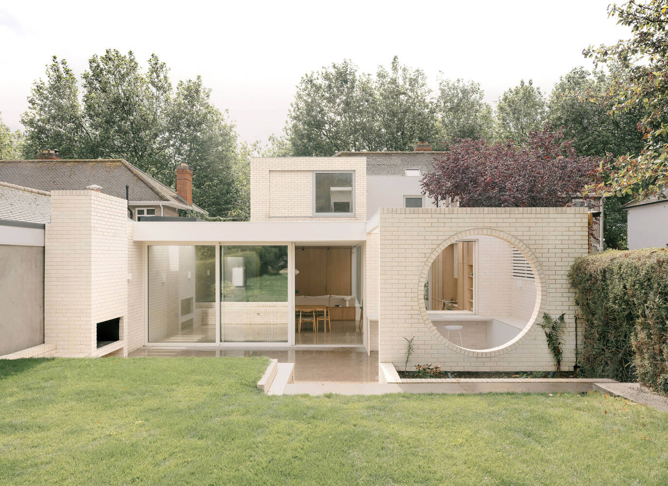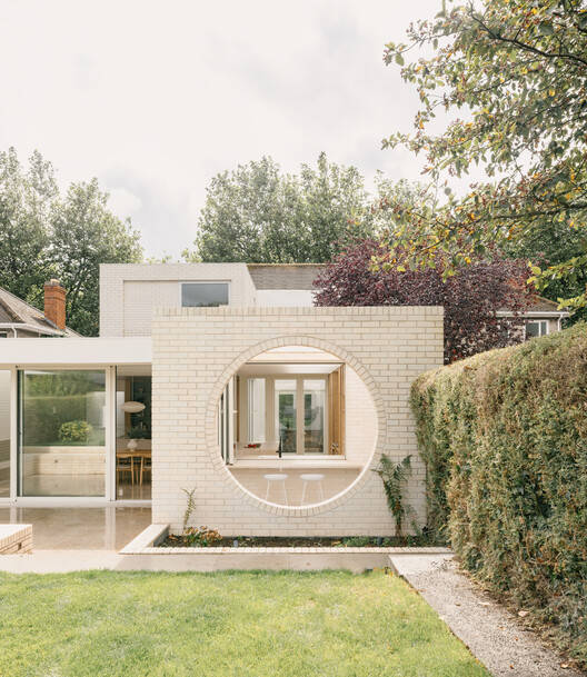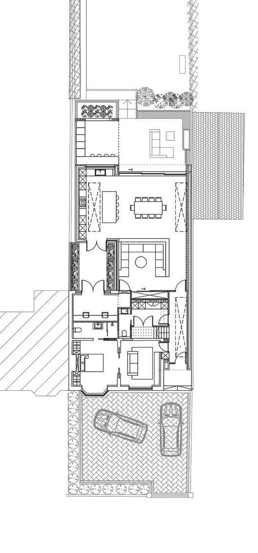 在新走廊扩建的尽头,一扇引人注目的白色水晶玻璃门通往一个面向后花园的现代化两层砖砌扩建部分。一楼包括开放式起居区、厨房和用餐区,而一楼则专用于主卧套房。一楼的庭院将自然光引入方案的核心。