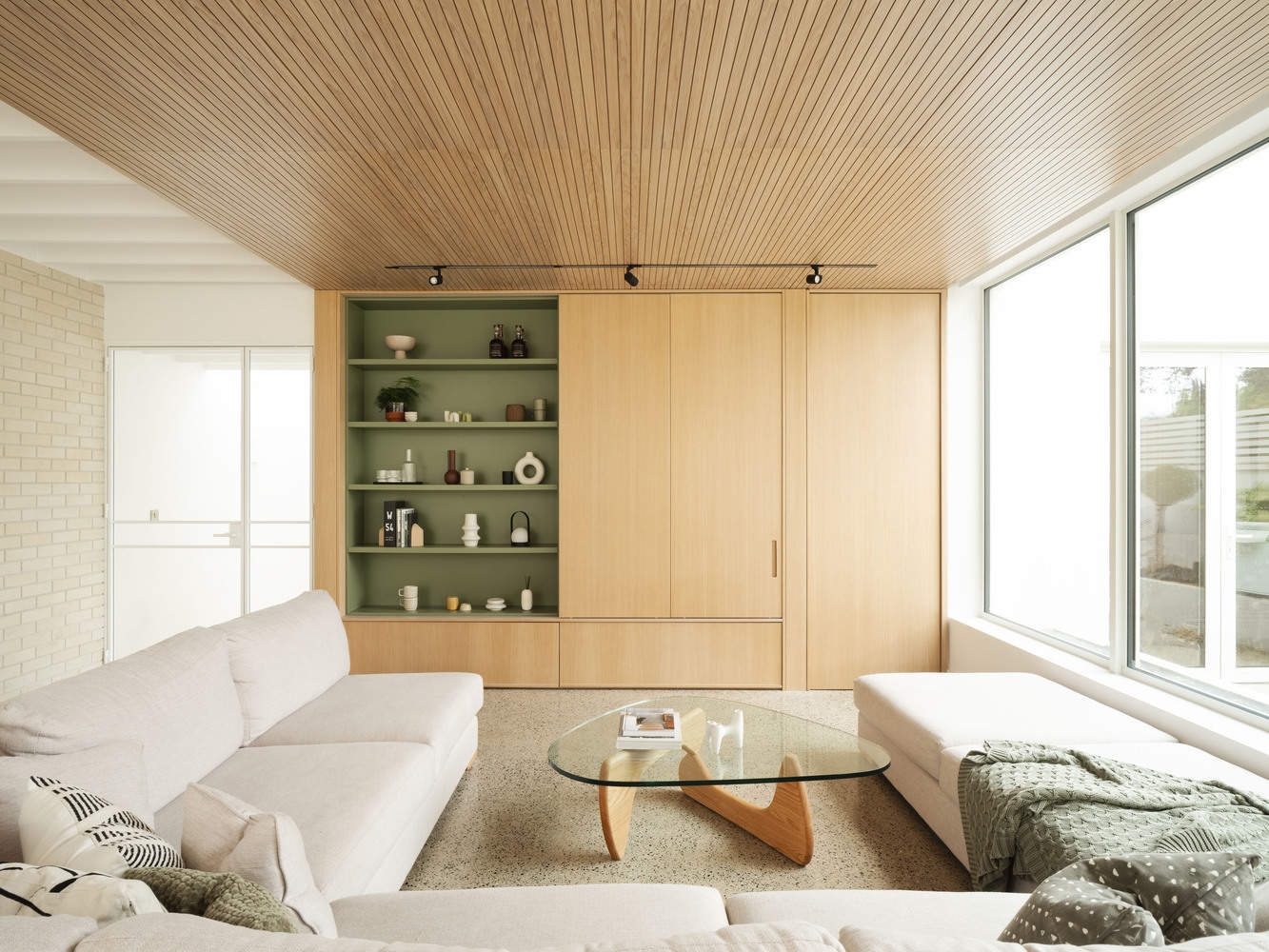 The original front reception rooms facing Griffith Avenue were preserved and repurposed as a guest suite to accommodate visiting family. A new side extension serves as a link between the old and new, featuring a relocated front door that faces the Avenue (originally located on the gable), a dramatic large roof light, and exposed timber joists that cast shifting patterns of light and shadow throughout the day. This transitional space discreetly houses access to the original rooms, via concealed paneled doors, to a coat closet, guest suite, utility, and WC.