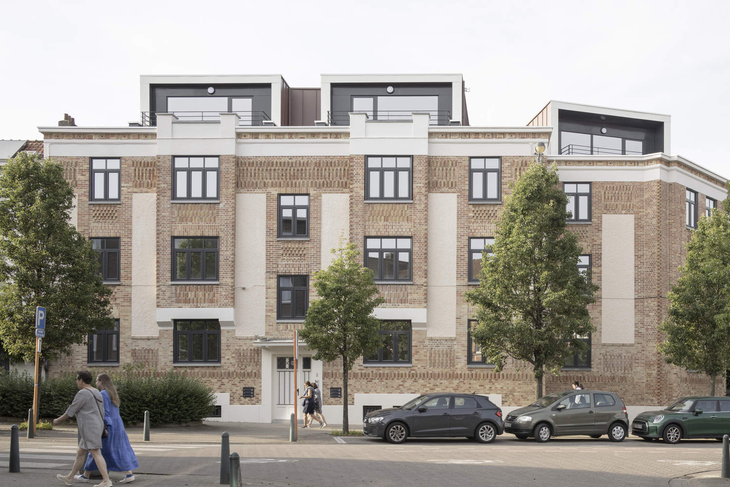 对建筑物的干预:前立面恢复到原来的形态,用和谐连贯的框架取代了20世纪70年代的窗户。建筑入口门也进行了更换,以尊重原始设计。立面的传统元素得到了恢复。维持现有的垂直循环系统。缺乏建筑特色的后立面和侧立面是隔热的,并覆盖着平坦的赤土瓦。非原始斜屋顶被拆除以恢复原始屋顶形状,从而可以添加新的体量。