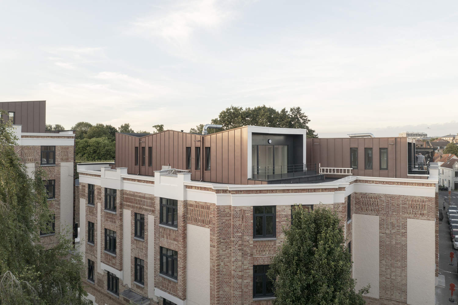 Addition of new Volumes: Additional volumes are added to the rear façades and roofs to increase the living area of the apartments and meet modern habitability standards. These extensions are built with lightweight structures (wooden framework) and clad in pre-patinated zinc siding in a heather-gray tone. These contemporary elements complement the existing structures while remaining discreet and set back from the historical elements.