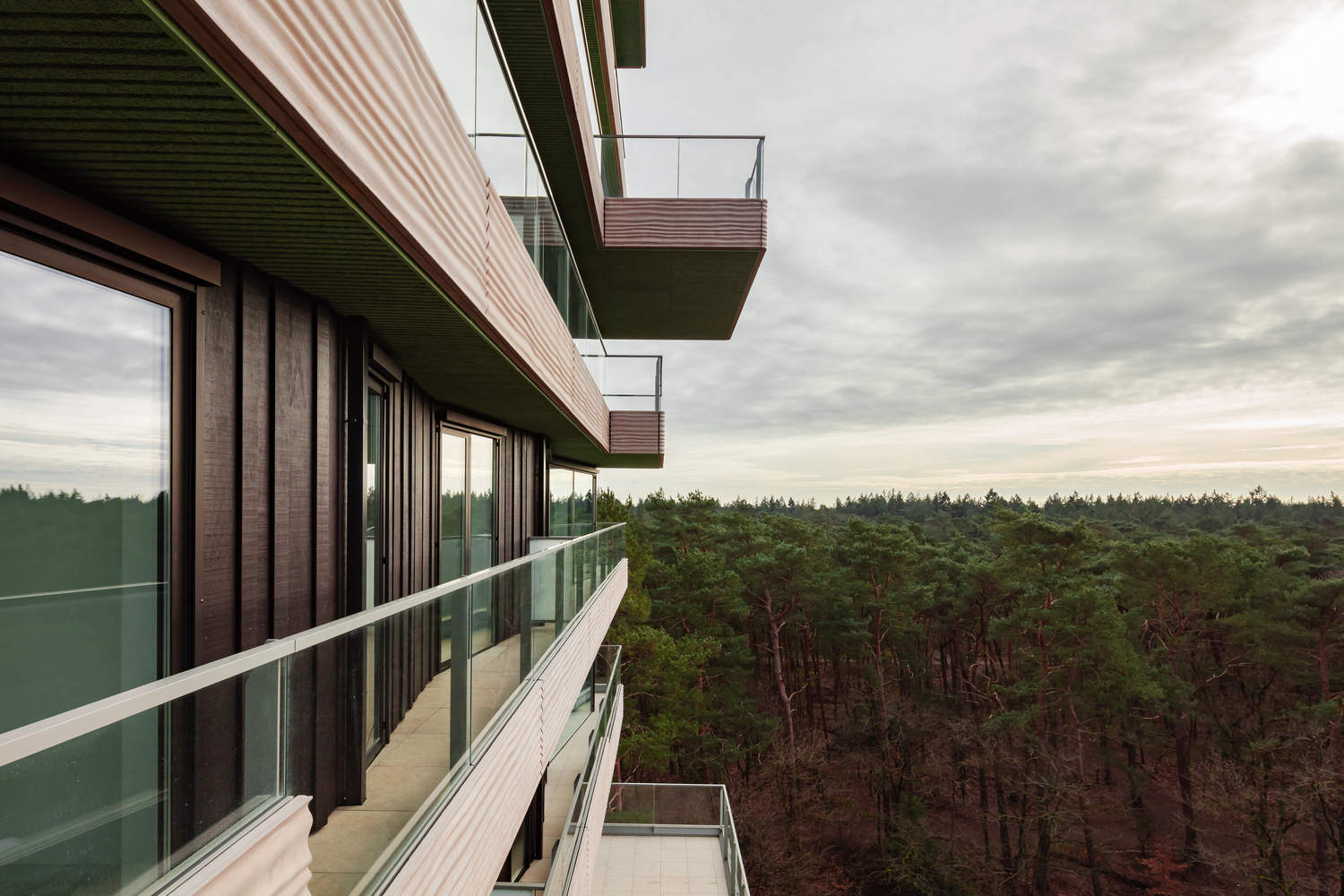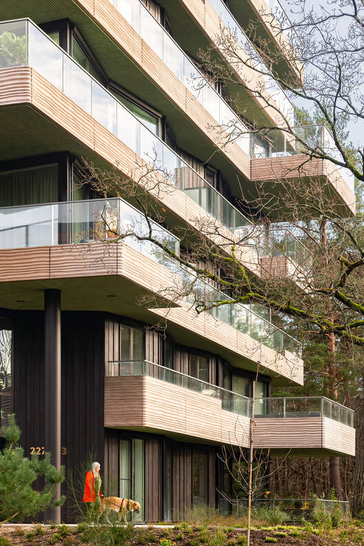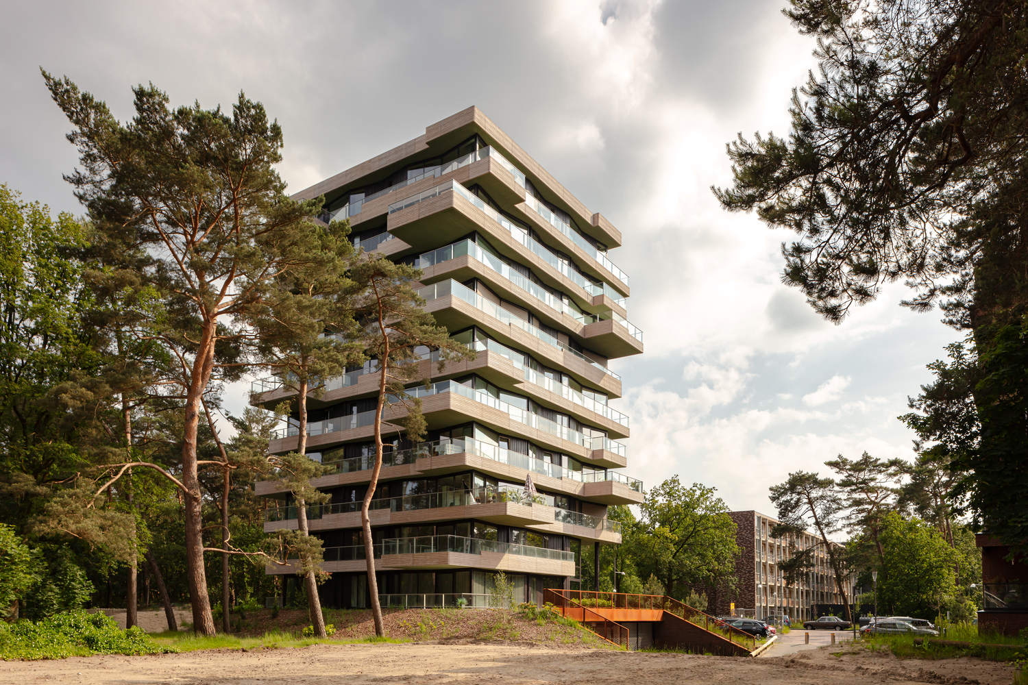 The tower looks sculptural, but it is also composed within a rational grid, with a supporting structure made up of the core and the columns set into the facade. This structure extends into the half-sunken car park, where the storage units of the apartments are also located. The building contains 10 floors above ground, with two L-shaped apartments arranged symmetrically on each floor, which are rotated 90 degrees with respect to the floor below. The exception within this configuration is the top floor, containing a penthouse with a 360-degree view of the surroundings. The apartments feature spacious outdoor spaces on all sides. The alternate floor slabs extending outwards create 'outdoor rooms' at strategic points. Here, the border between inside and outside seems to blur, allowing the wooded surroundings to become part of the living experience on this remarkable site. Because the apartments on each floor are mirrored, the outdoor spaces on each level are positioned differently. The theme of 'sand' encompasses the balcony parapets and terraces. Outdoor ceilings are designed as part of the 'leaf' theme, taking the form of an informal green finish on all the lower sides of balconies and cantilevered surfaces. Finally, the supporting columns and Frake timber façade cladding are elaborated as part of the 'tree trunk' theme.
