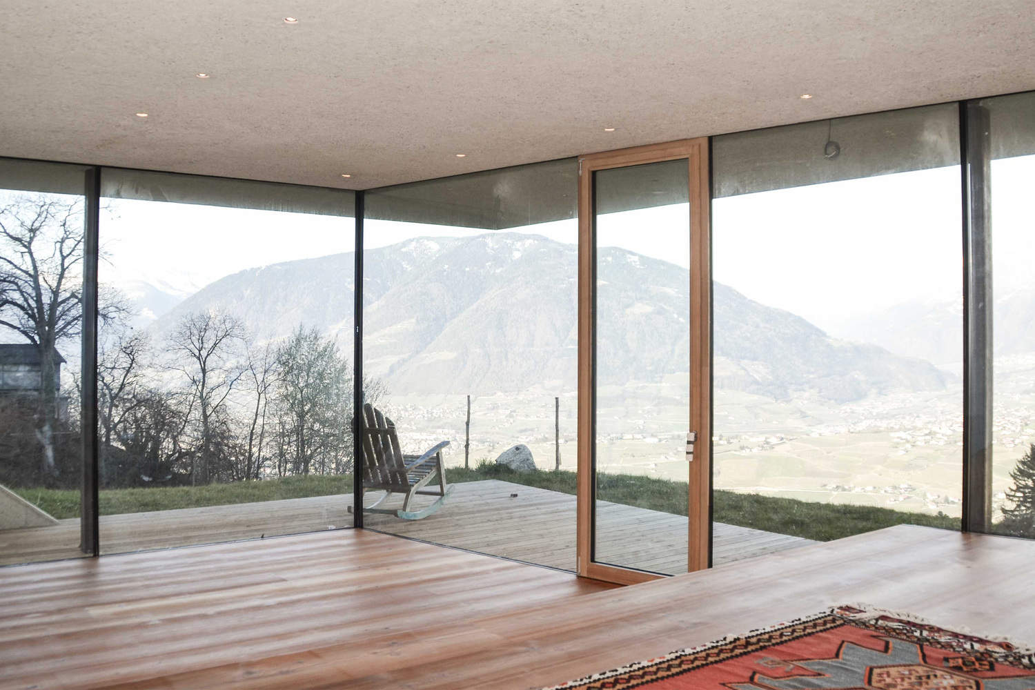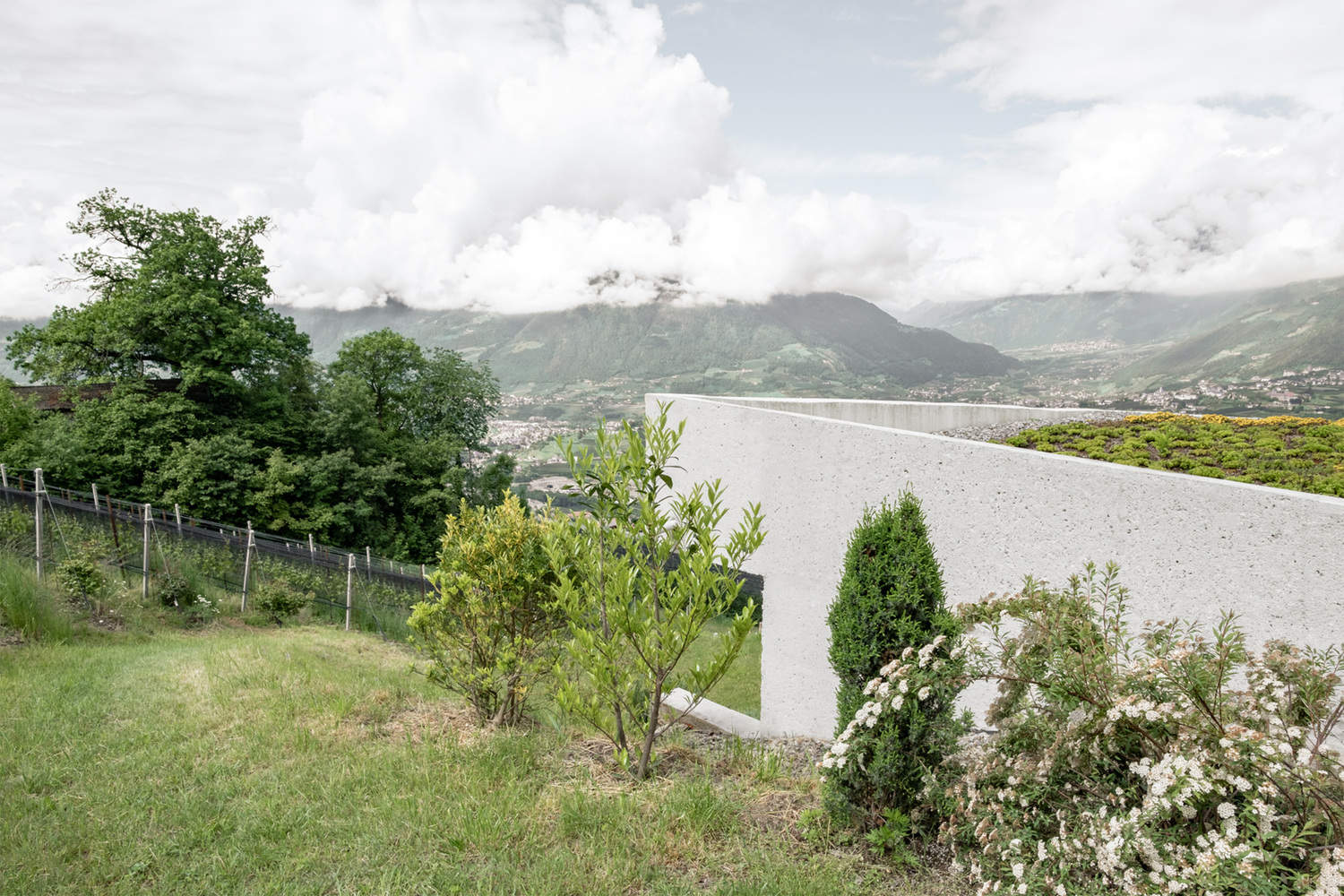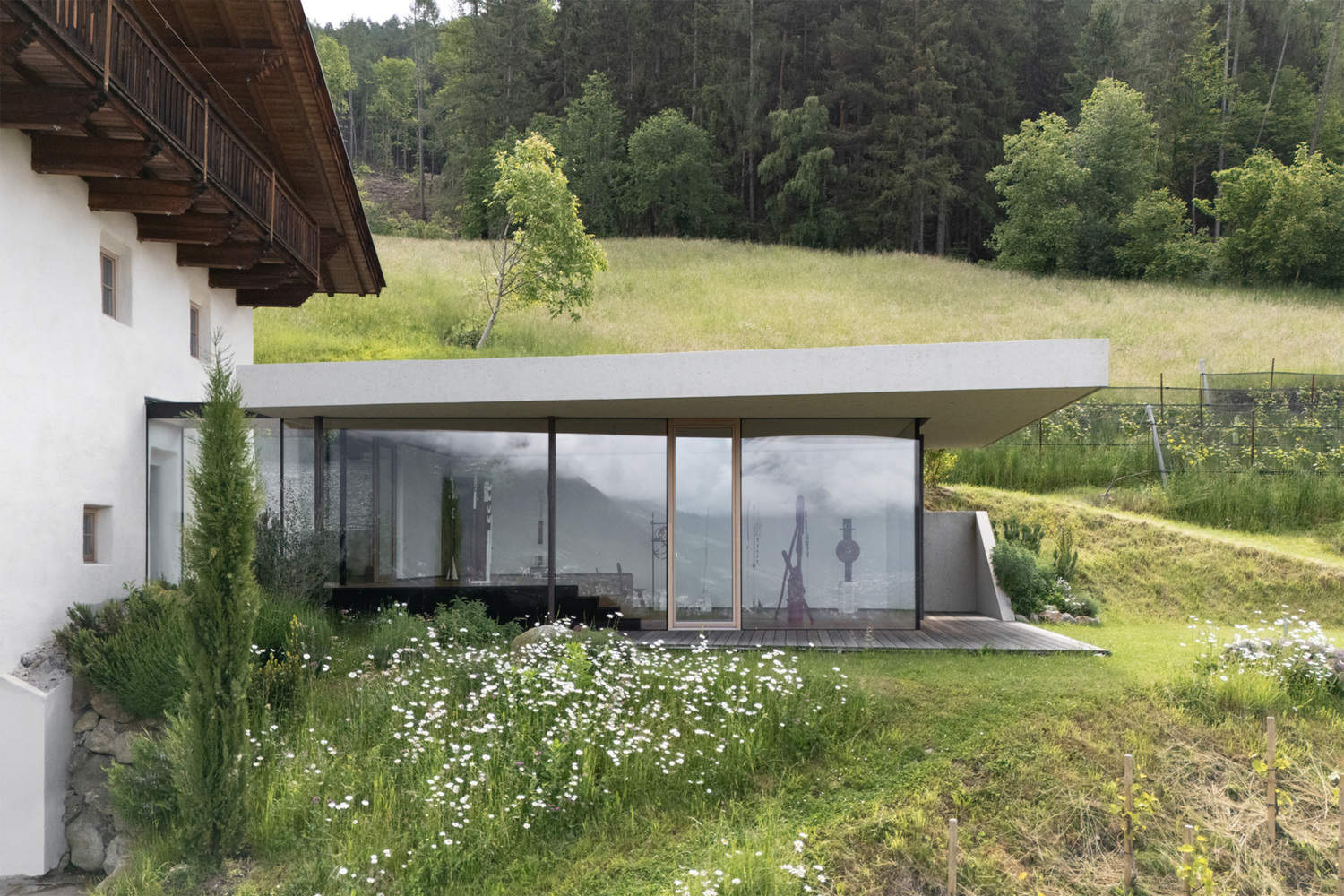 Its slightly offset position in relation to the slope line provides a clear contrast to the existing building without overshadowing its presence. Particular attention was paid to ensuring a seamless connection between the old and new. The glass transition marks the point where historical and modern architectural styles converge, creating a transparent and lightweight aesthetic. The extension is designed to blend discreetly into the surrounding landscape, featuring a green flat roof that minimizes its visual impact from above. The large, frameless glazing provides an unobstructed view of the surrounding vineyards and the expansive view of Merano.