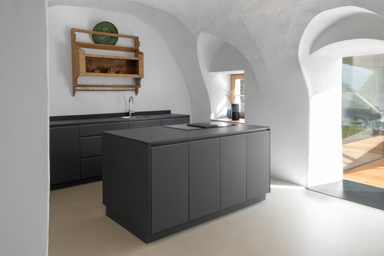 The interior of the farmhouse has been meticulously remodeled. The old smoke kitchen was uncovered, with the soot-blackened barrel vault serving to emphasize the original atmosphere. The modern built-in steel furniture and exposed screed floors blend in seamlessly with the historical substance, creating a subtle contrast. The wooden parlor and other historical elements, including the vaulted staircase and the marble split floors, have been meticulously restored to their former glory, contributing to the authentic ambiance that characterizes the courtyard.
