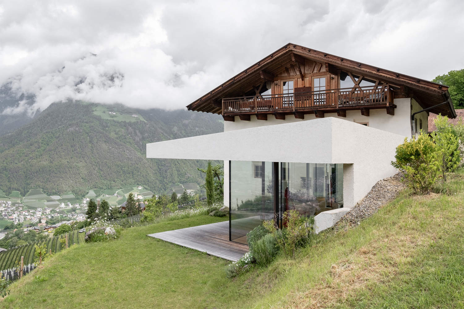 建筑师提供的文字描述Text description provided by the architects. The Ausserrothhof is an excellent illustration of how historical significance and modern architectural design can coexist harmoniously. The listed and heritage-protected farm is situated in the sunny Italian village of Schenna, surrounded by its own vineyards. The old farmhouse was carefully remodeled and a modern extension was added.