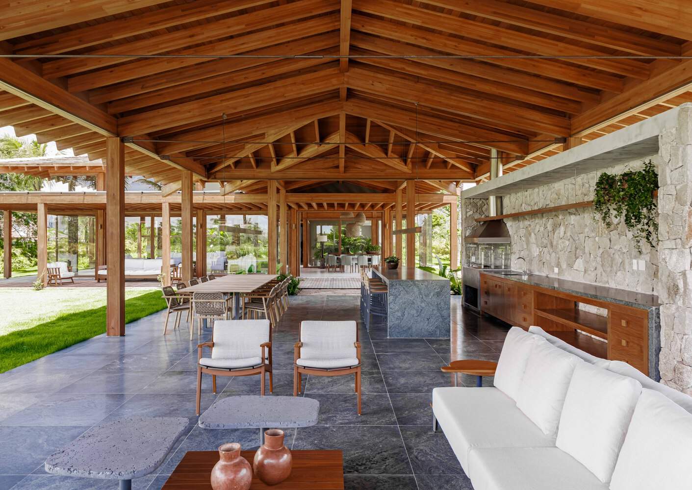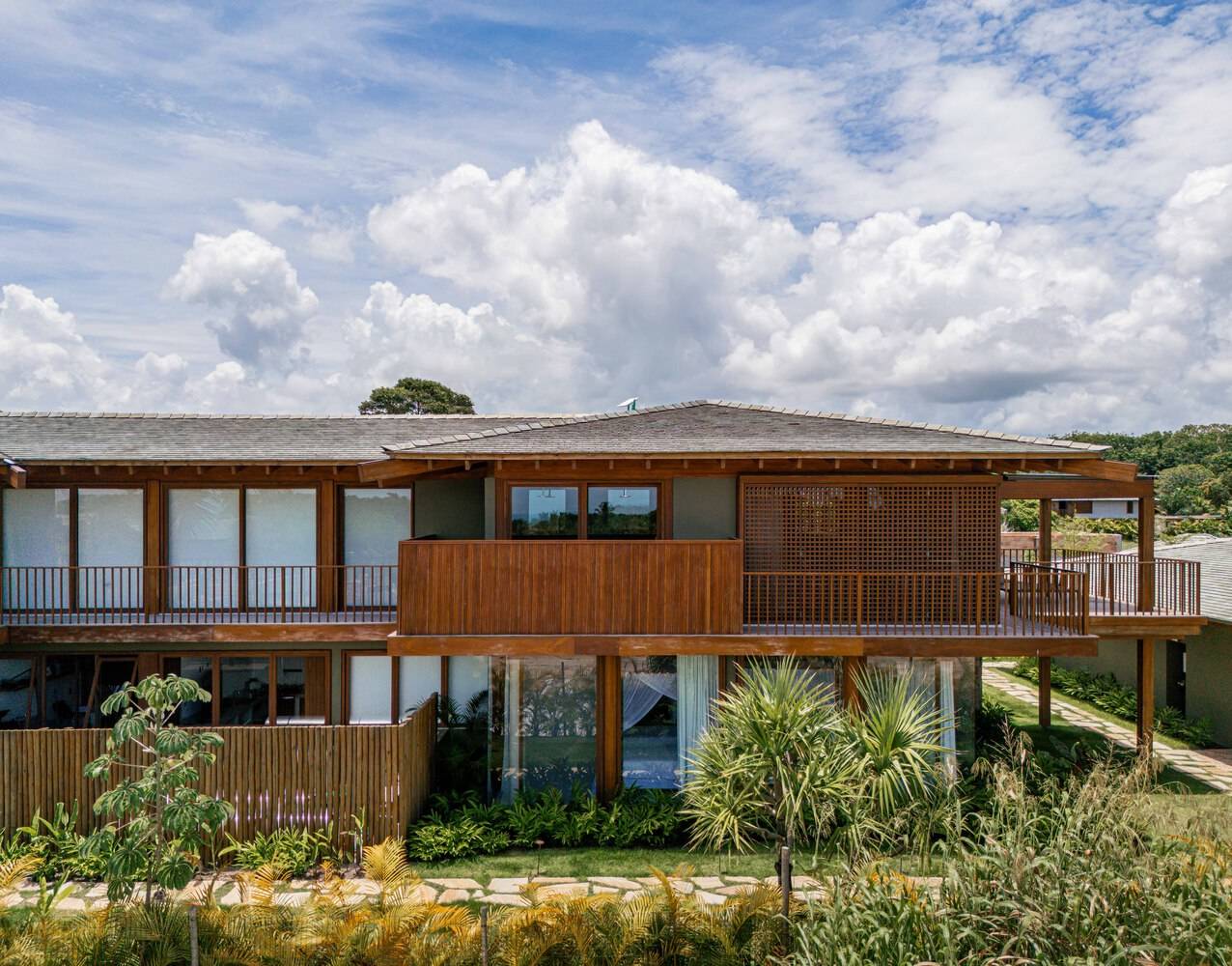 To reinforce the connection with nature, the elements used are, for the most part, natural, such as the wooden structure, micro cement flooring, cumaru wood deck, pool covering and water mirrors in green candeias granite, moledo stone on the garden walls, pine wood tiles and copper lamps.