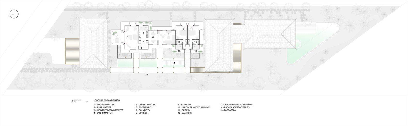 Module 02, with two floors, is composed on the ground floor of two guest suites, cellar, toilet, kitchen, laundry area and caretaker's house; on the upper floor, there is a master suite, two suites for the children, a TV room and a small office. All suites face east. The suites on the upper floor received extra protection on the facade, a wooden muxarabi-type frame, bringing more thermal comfort and privacy. All suite bathrooms, as well as the toilet, have a private garden.