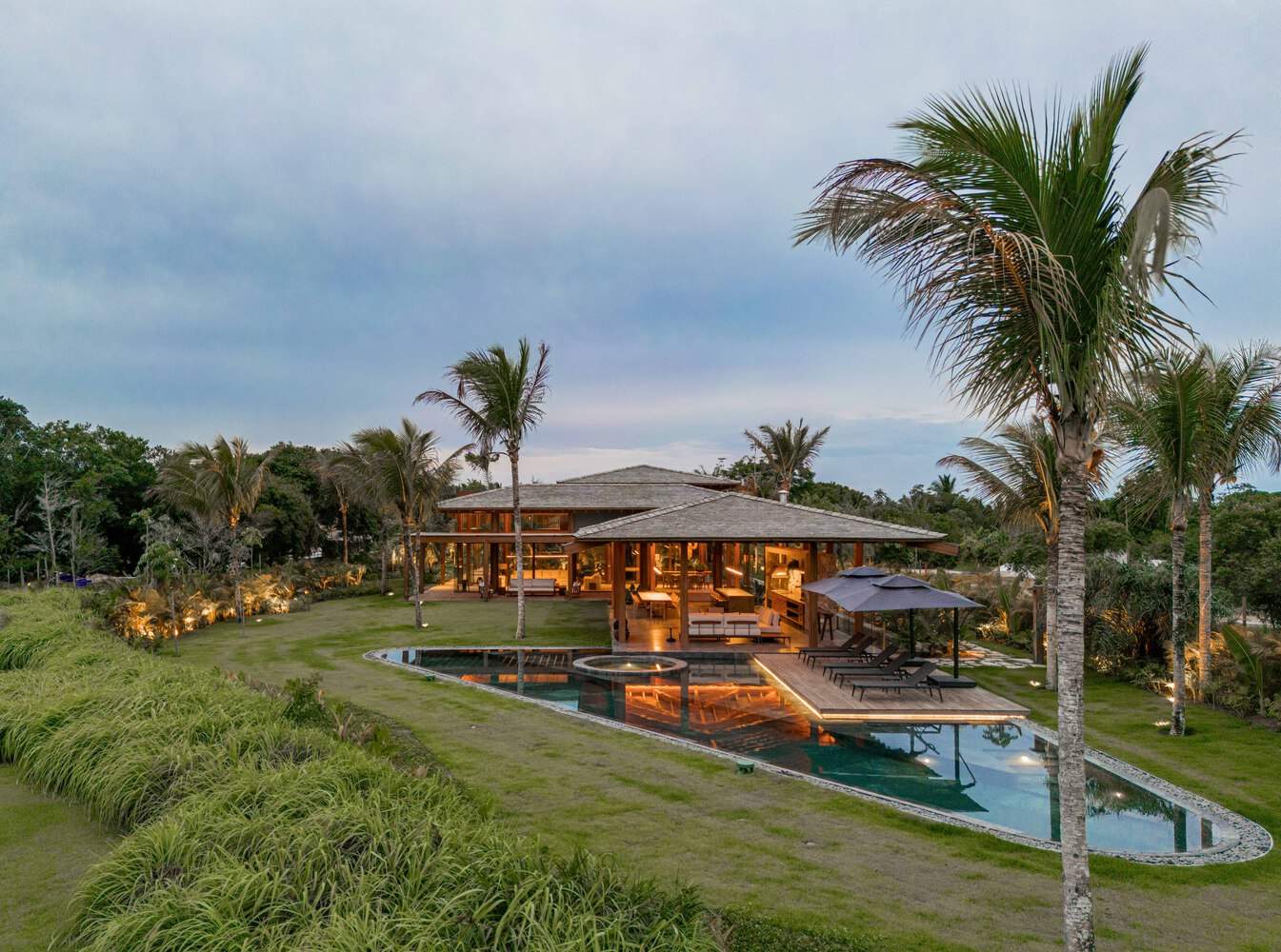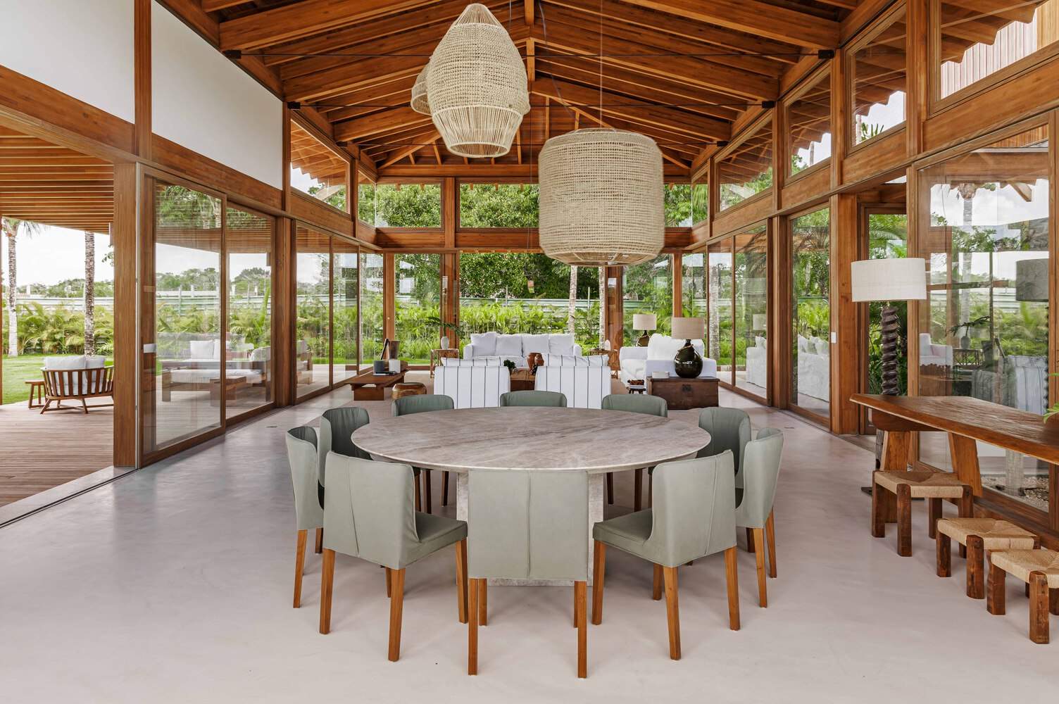 为了加强与自然的联系,所使用的元素在很大程度上是天然的,如木结构、微水泥地板、cumaru木甲板、绿色坎代亚斯花岗岩的游泳池覆盖物和水镜、花园墙上的moledo石、松木瓷砖和铜灯。