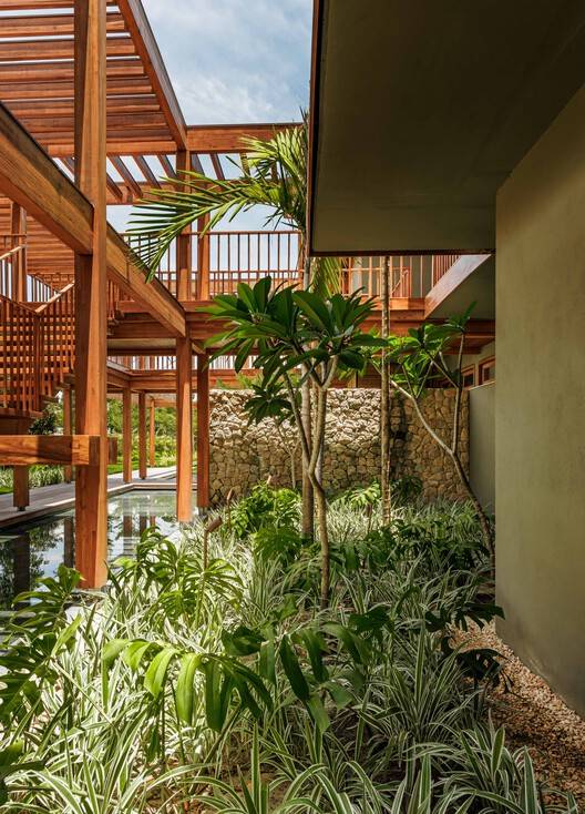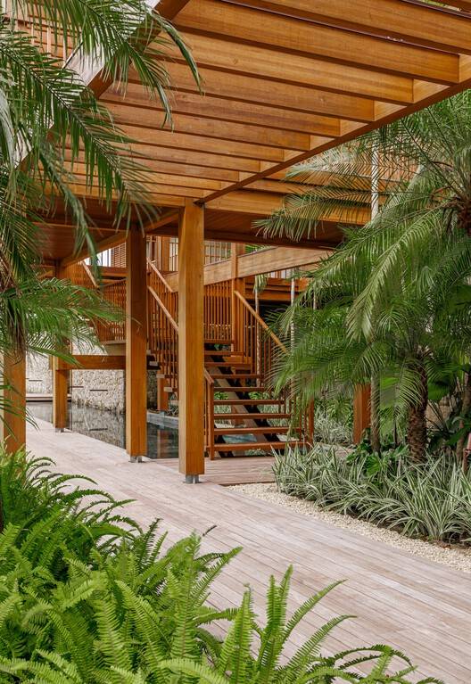 Modules 03 and 04 are close to a large grassy area of the condominium, which, thanks to the low landscaping of the border, is mistaken for an extension of the land. Connections between the modules are made through a wooden walkway, which invites you to take a walk amidst the greenery, the sounds of birds and the water mirrors, which also have a cooling function.