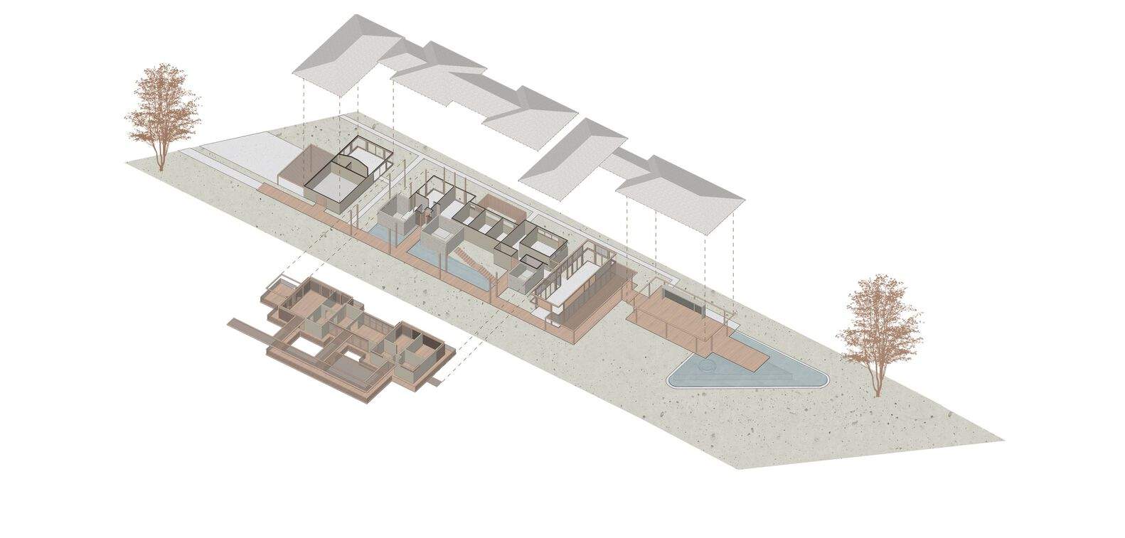 模块03和04靠近公寓的一大片草地,由于边界的低景观,这被误认为是土地的延伸。模块之间的连接是通过一条木制走道进行的,它邀请您在绿树成荫、鸟鸣声和水镜中散步,水镜也具有冷却功能。