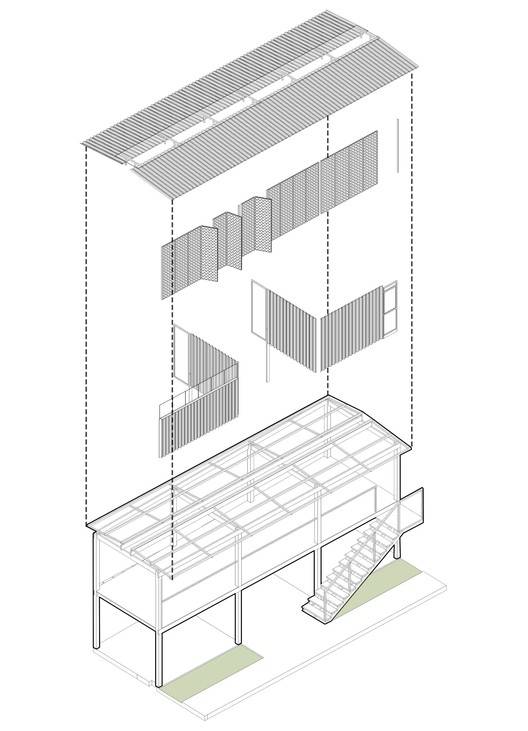 在住宅中,窗户下的围兜会过滤掉植物生长的痕迹。一个小露台的设计是为了增加进入房子的光线和通风量,在前立面上,我们用一扇大的半透明玻璃门增加了开口。