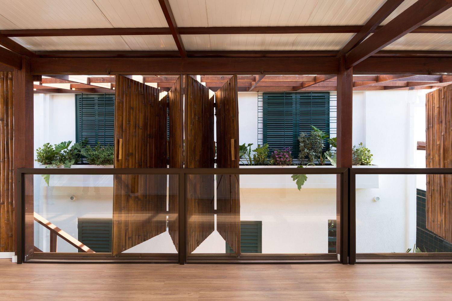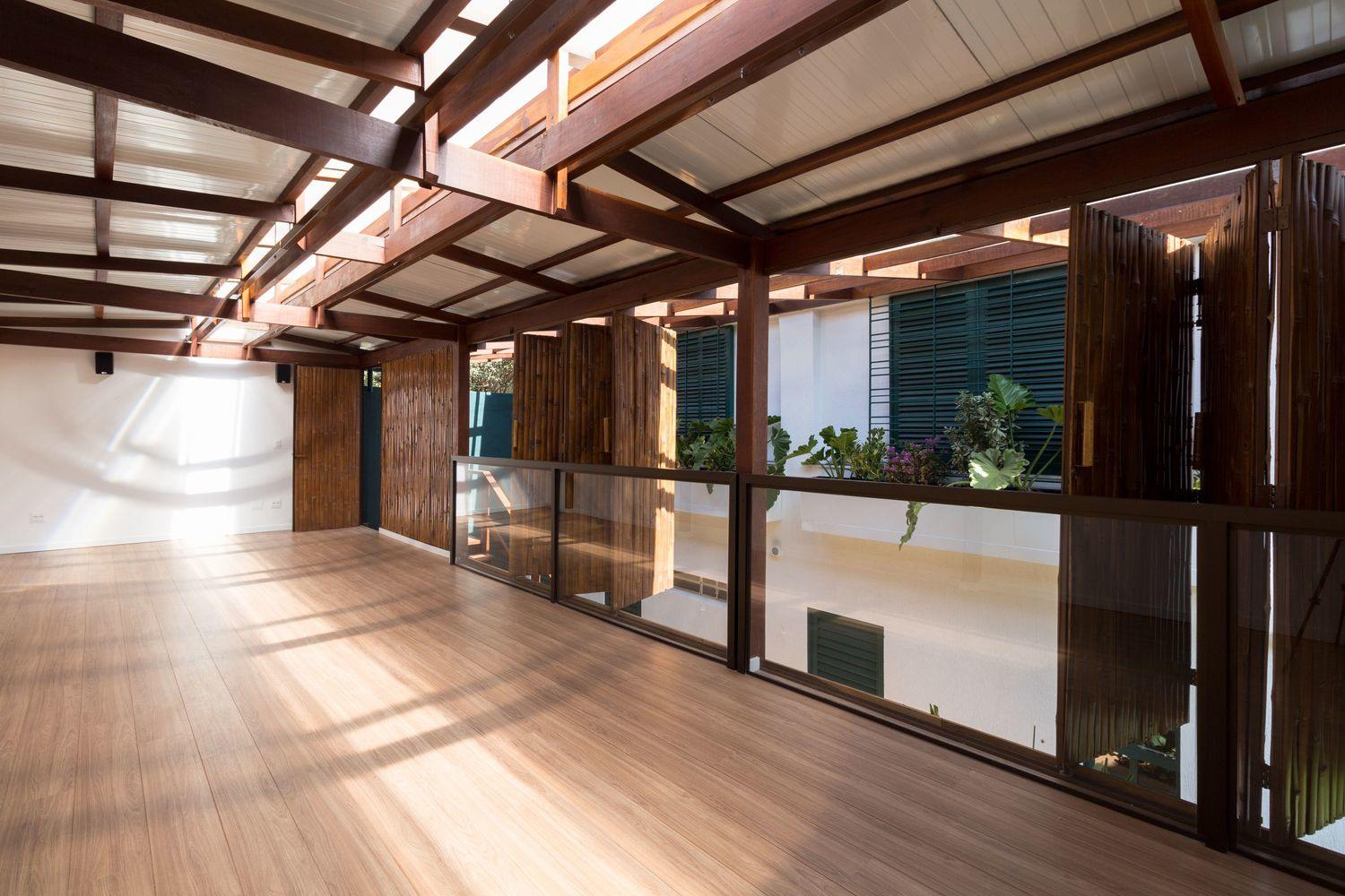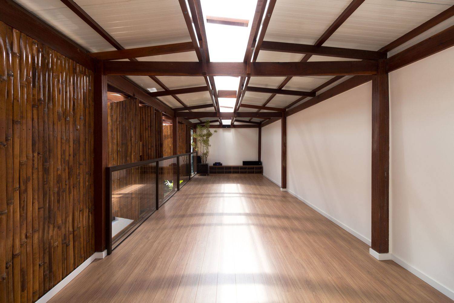 We handle the openings to allow for privacy both in commercial and residential. In the commercial, the new pavilion received movable bamboo frames that allow controlling the visibility to the windows of the residential space. When the bamboo frames are closed, a linear zenith opening brings natural light into the yoga room.