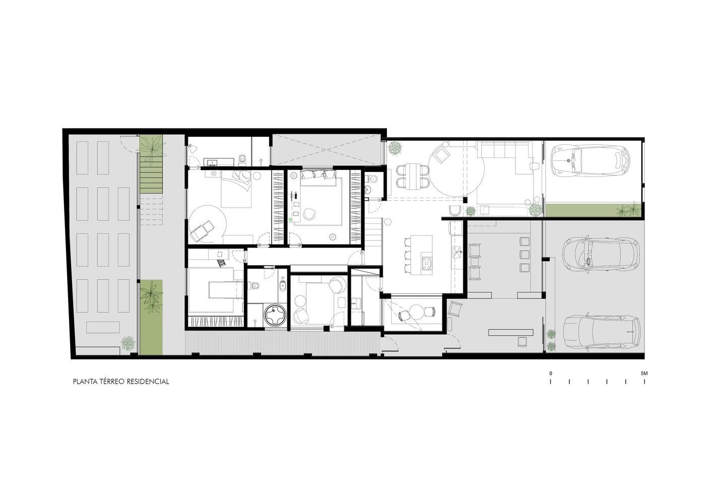 Required for the conformation of the house, part of the facade, a cave and the street were the possible spaces for commerce and services, but we would have to provide it with a small area, access by an extensive side corridor and limited ceiling height. In addition, this division into two distinct spaces also generated the challenge of keeping the spaces large, with privacy, guaranteed lighting and natural resources for the residential part.