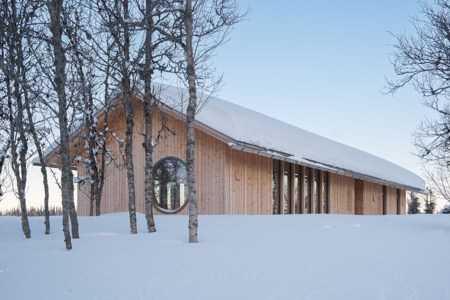 A large round window adds an intriguing element, offering a peek into the inviting interior and establishing a visual connection between inside and out. Built entirely from solid wood, the cabin has a strong structural expression. Exposed cross-laminated timber defines both the interior and exterior, with untreated pine cladding that will weather naturally, developing a grey patina that mirrors the aging landscape. This material choice not only roots the cabin in its surroundings but also creates a warm, intimate atmosphere inside, where smooth pine paneling evokes a sense of calm and comfort.