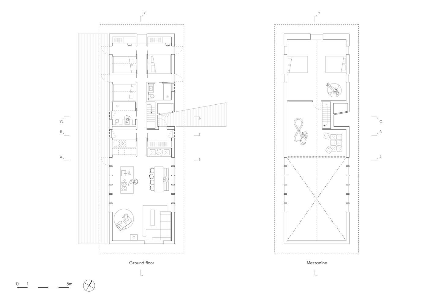 一个大的圆形窗户增加了一个有趣的元素,让人一窥迷人的内部,并在内外之间建立了视觉联系。小屋完全由实木建造,具有很强的结构表现力。暴露的交叉层压木材定义了内部和外部,未经处理的松木覆层可以自然风化,形成反映老化景观的灰色光泽。这种材料选择不仅使小屋植根于周围环境,而且在内部营造出温暖、亲密的氛围,光滑的松木镶板唤起了一种平静和舒适的感觉。