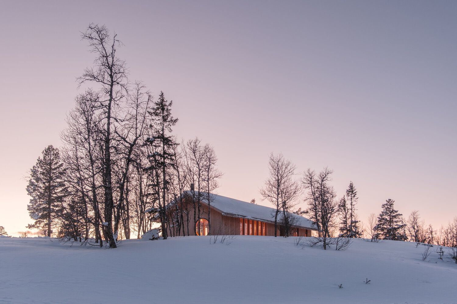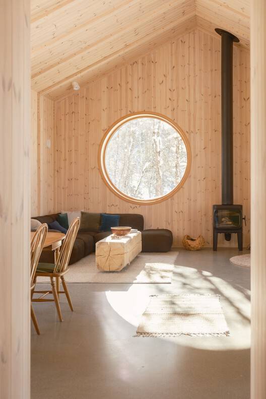 Designed to seamlessly integrate with its natural setting, the cabin placement preserves much of the existing vegetation. Visitors leave their cars by the road and walk through a birch forest to reach the entrance. This minimal disruption to the landscape emphasizes the intent to create a respectful dialogue between the built environment and nature. The resulting architecture is characterized by its simplicity and ruggedness. The Timber Nest's rectangular form is punctuated by a bold cut, marking the entrance, and offering sheltered storage for winter equipment.