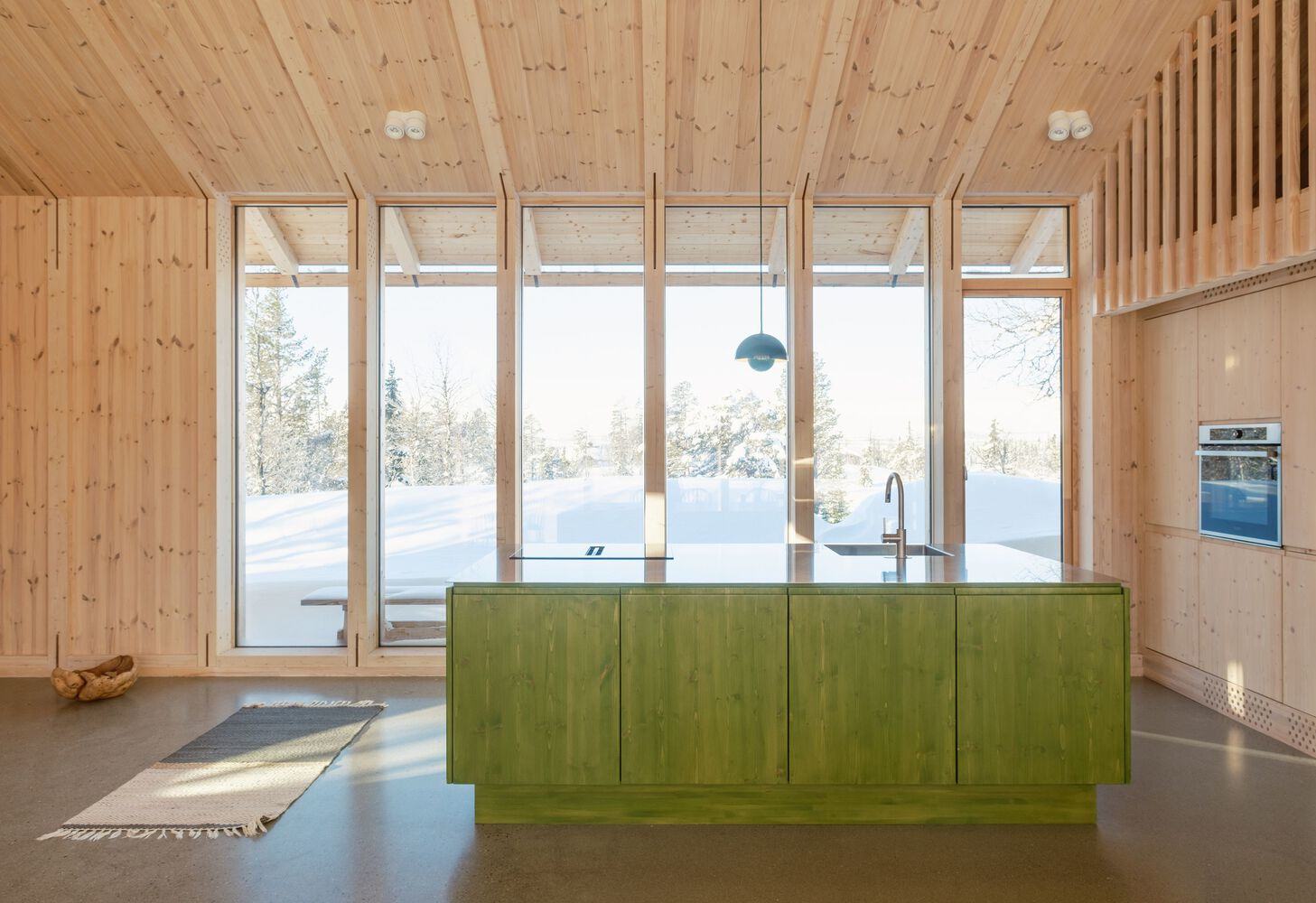 In contrast to the warmth of the wood, the polished concrete floor with underfloor heating introduces a tactile interplay between raw and refined materials. Custom cabinetry and furniture crafted from cross-laminated pine further enrich the interior, with select pieces treated in green to create sculptural focal points, such as the kitchen island and staircase. The extensive use of wood also imparts a distinctive, unique olfactory quality to the retreat. Deferring to the natural mountain landscape all around, the architecture spectacularly engages the outdoors. Integrated within the wooden structure, floor-to-ceiling glazing invites the landscape inside, dissolving the boundary between interior and exterior and highlighting the landscape's ever-changing scenery on which the cabin life is based. The Timber Nest cabin exemplifies thoughtful, site-specific design, celebrating Norway's architectural heritage while offering a sanctuary for its inhabitants.