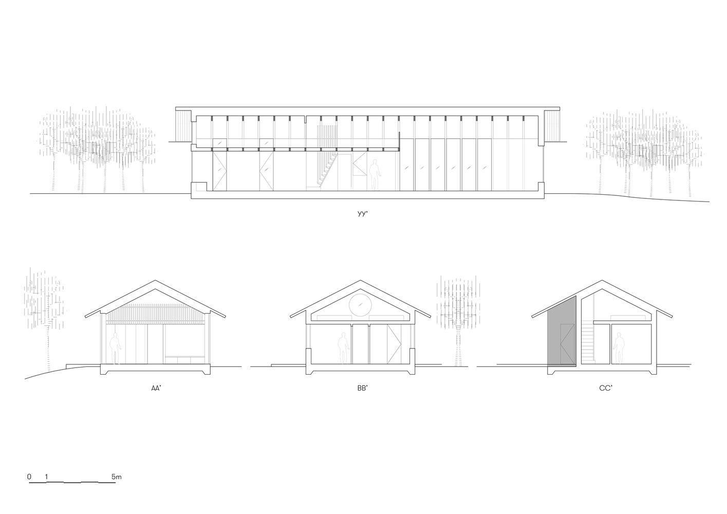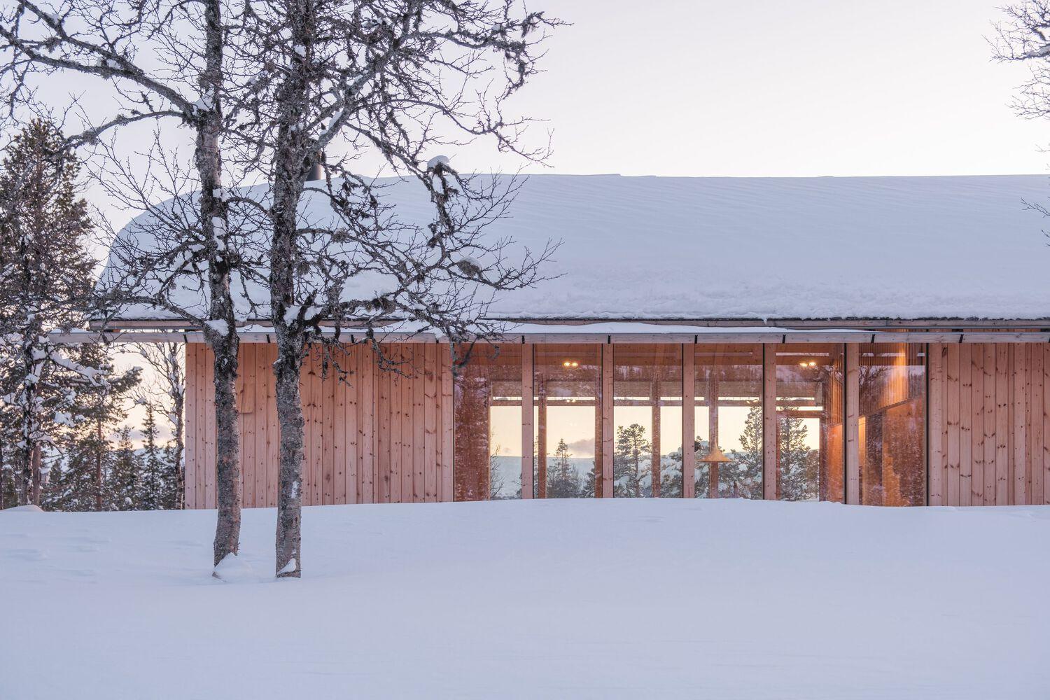 机舱布局旨在与自然环境无缝融合,保留了大部分现有植被。游客们把车停在路边,穿过桦树林到达入口。这种对景观的最小破坏强调了在建筑环境和自然之间建立尊重对话的意图。由此产生的建筑以其简单性和坚固性为特征。Timber Nest的矩形形状点缀着大胆的切割,标志着入口,并为冬季设备提供了庇护存储。