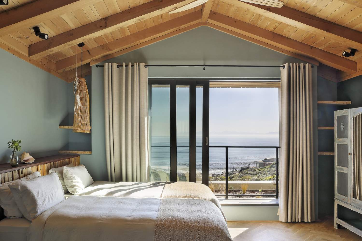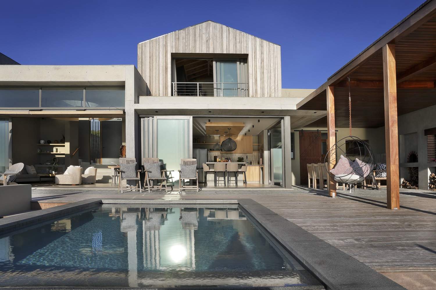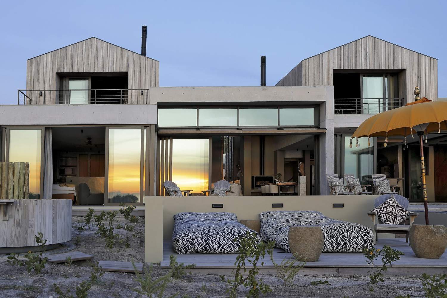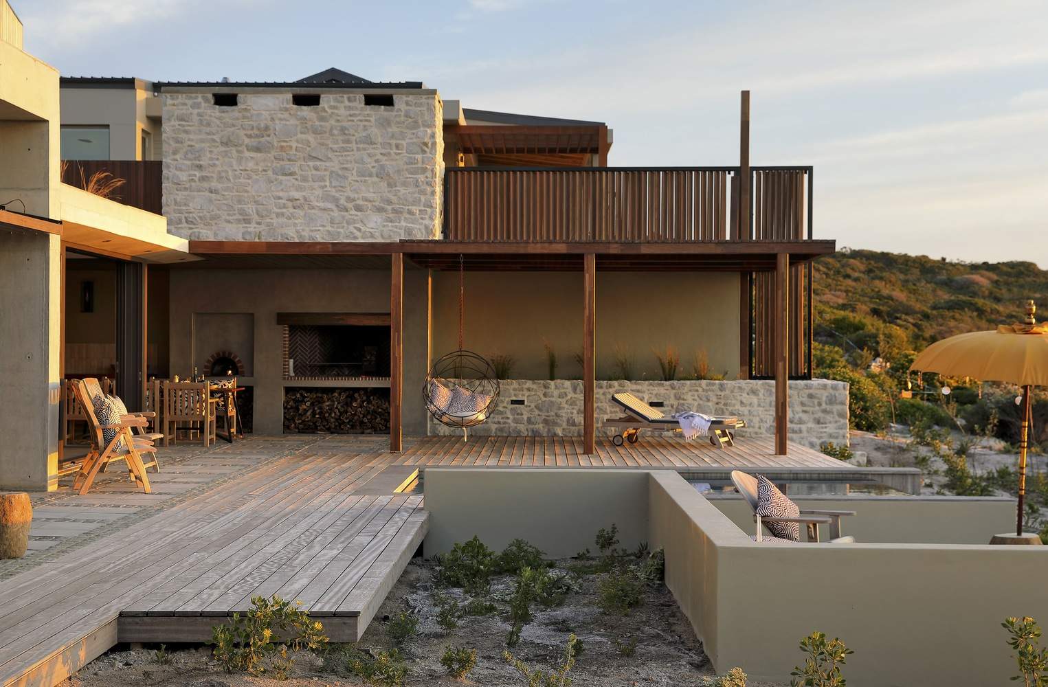 设计理念与环境的和谐统一:“House Azure”项目最令人称道之处在于其与自然环境的完美融合。建筑师巧妙地将住宅融入Romansbai Fynbos庄园的独特环境中,汲取斯堪的纳维亚设计精髓,强调简洁、空间和谐以及与周围景观的共生关系。通过半独立亭子的设计,原生植物得以渗透到建筑结构中,消解了建筑与景观之间的界限,创造了多孔的建筑形态。这种设计不仅实现了建筑与环境的视觉统一,更在居住体验上,实现了人与自然的深度连接,体现了设计对当地生态环境的尊重和保护。