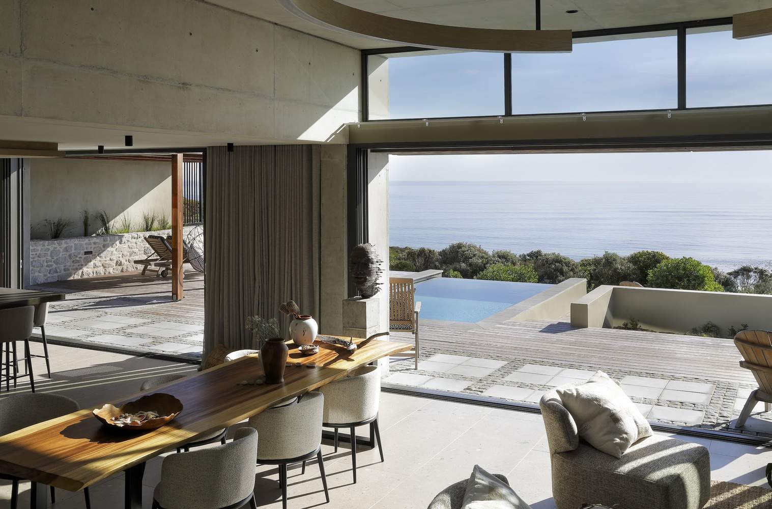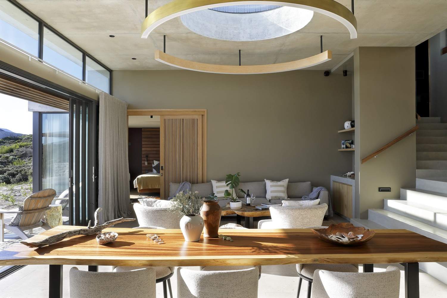 Upon entering, the striking foyer, with its double volume and full-height windows, directs your gaze to the vast ocean horizon. This effect is enhanced by a large circular skylight & pendant that serves as a central feature, connecting the open-plan living areas. This element not only delineates zones within the interior but also reinforces the interplay between warmth and materiality, enhancing the tactile and atmospheric qualities of the home.