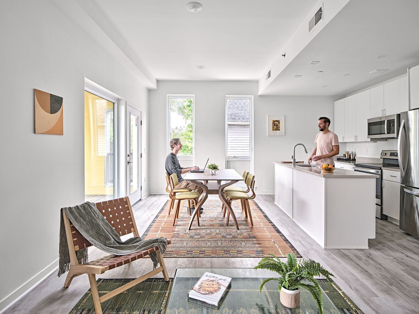 Super Porch - The required front yard setback created an opportunity for an expanded and activated public streetscape. The facade reinvents the historic superporch as an enhanced social streetscape amenity. Meeting the ground with a small cafe and landscaped yard, the folded planes create facade depth while maximizing views and providing unique outdoor balconies for units facing West Willis. The common roof deck is situated overlooking the streetscape, creating a connected experience for residents as well as passersby.