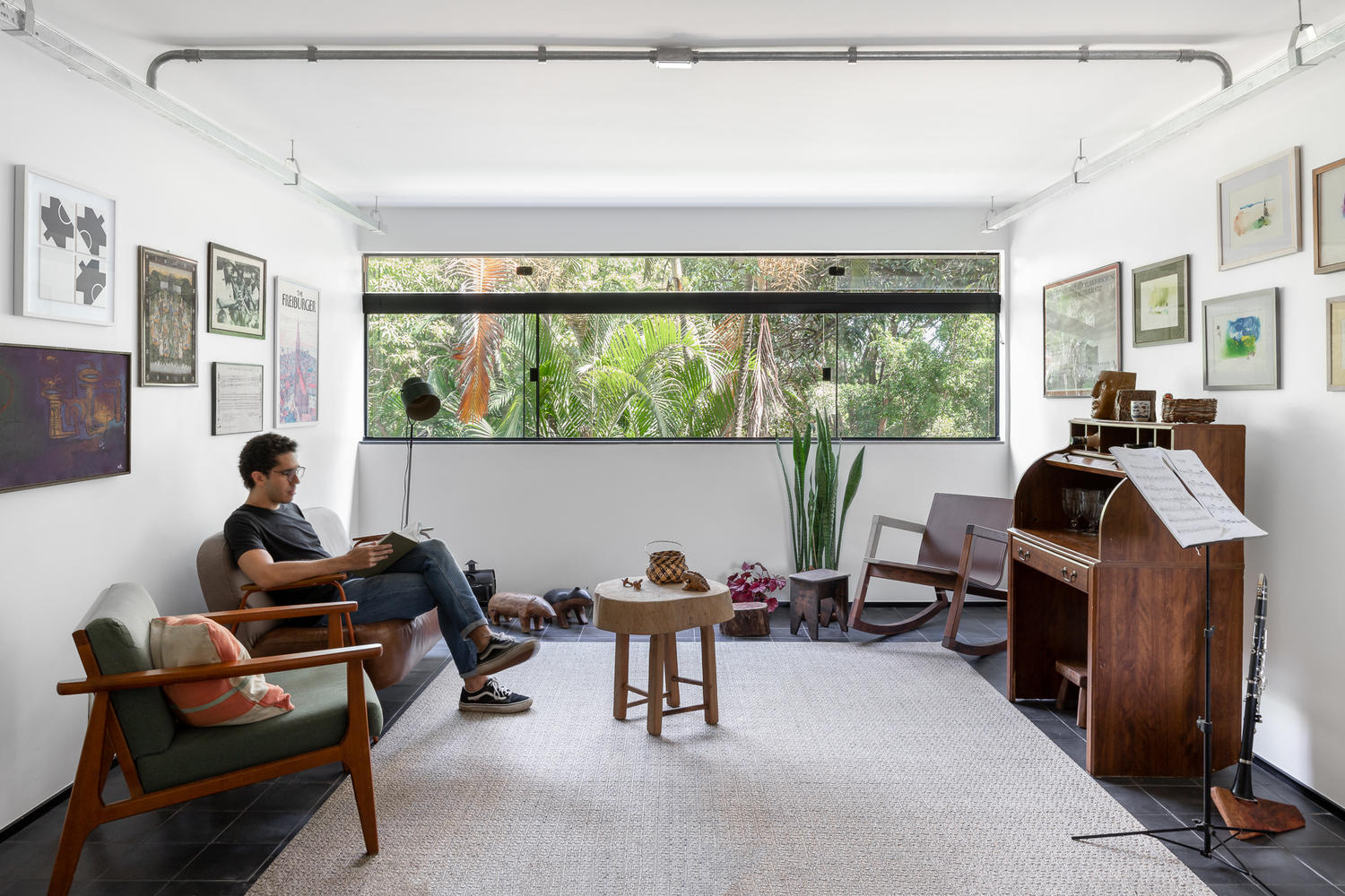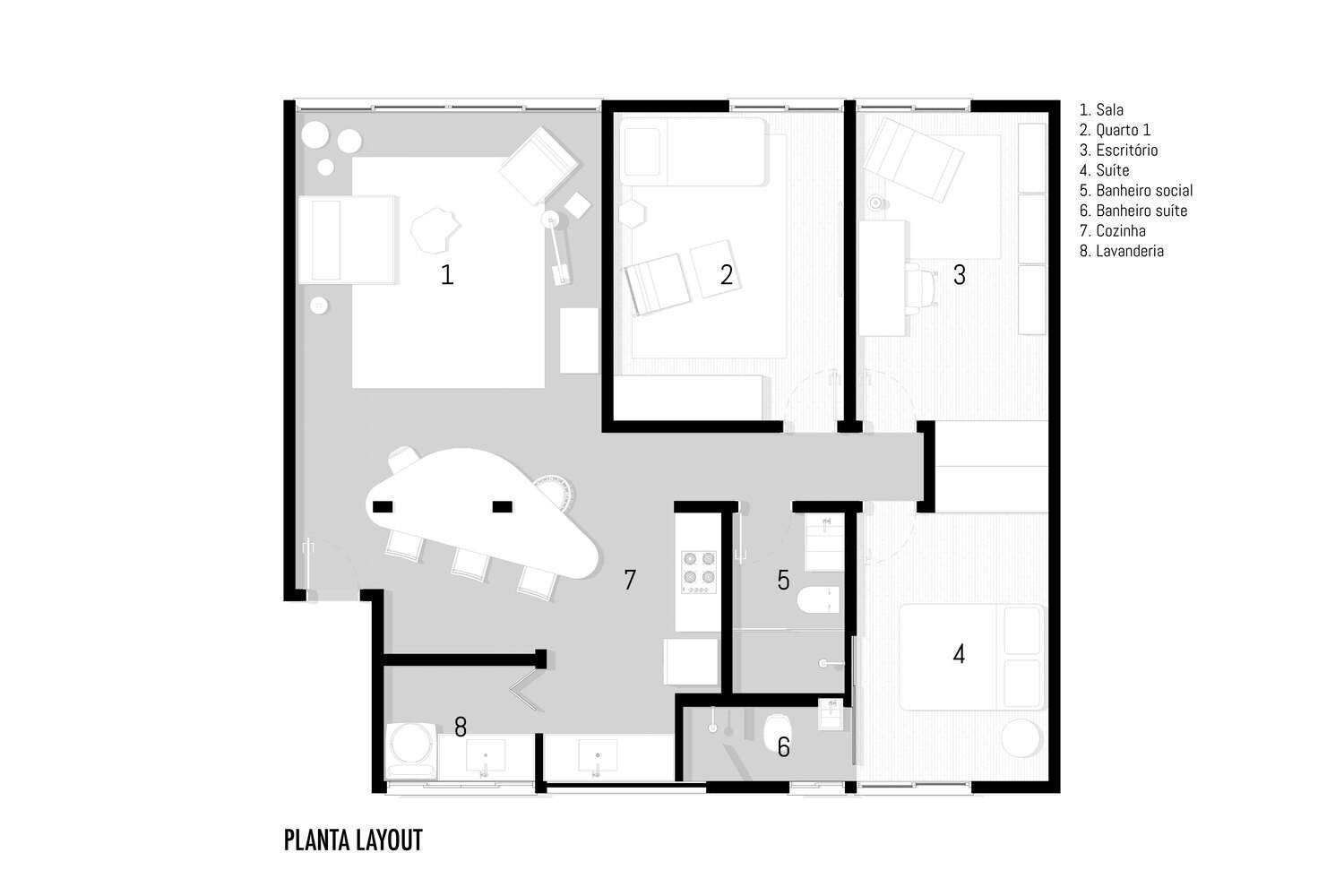 在我们第一次参观公寓时,我们发现卧室仍然保留着原来的木拼花地板,隐藏在浮动地板下。我们决定修复这块木头,保护它的历史。在社会和潮湿地区,之前的翻修用瓷砖取代了原来的地板,但并没有改善房产。对于这些空间,我们选择了黑色液压瓷砖。这一选择具有情感意义,同时也参考了巴西利亚的住宅建筑,这些建筑的飞行员都是黑色地板。此外,地板形成的对比突出了客户的家具和艺术品。