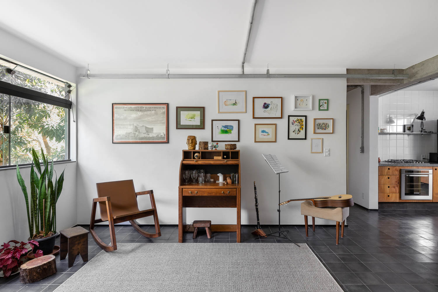 During our first visit to the apartment, we discovered that the bedrooms still preserved their original wooden parquet flooring, hidden beneath a floating floor. We decided to restore this wood, preserving its history. In the social and wet areas, the previous renovation had replaced the original floors with ceramic tiles that didn’t enhance the property. For these spaces, we opted for black hydraulic tiles. This choice carries an emotional significance while also referencing residential buildings in Brasília that feature black floors in their pilotis. Additionally, the contrast created by the flooring highlights the client’s furniture and artwork.