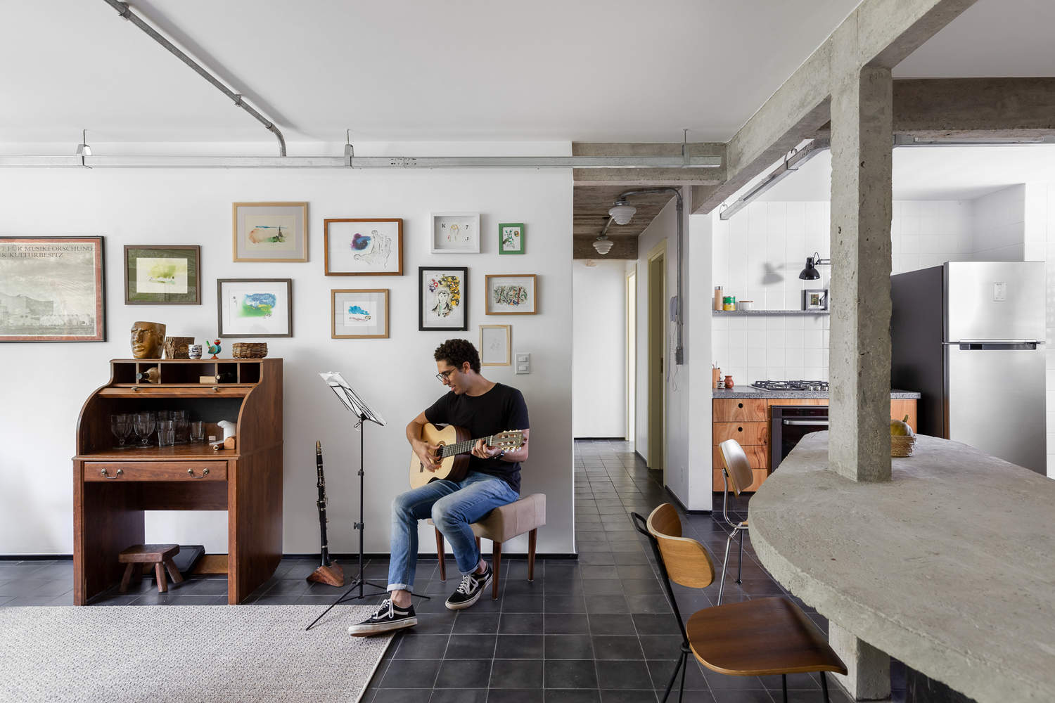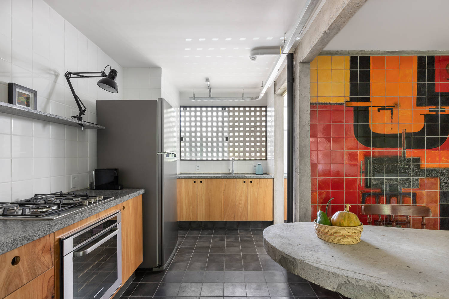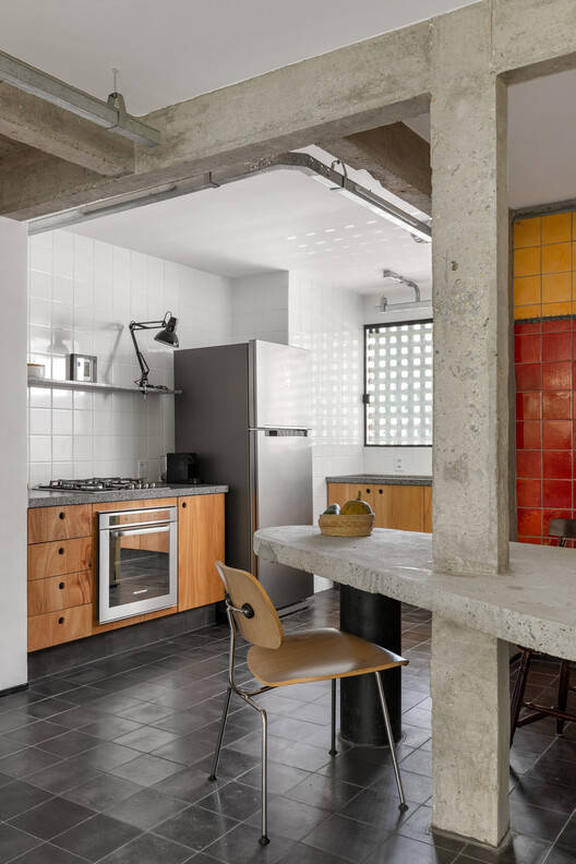 主要的干预措施之一是将厨房与客厅融为一体,这揭示了混凝土结构和cobogós,这些元素增强了建筑的交叉通风。在这两个空间之间的过渡中,这对暴露的柱子成为了我们在暴露的混凝土中设计的桌子的支撑。它的有机形状是对圣保罗最具标志性的建筑之一:科潘的间接致敬。